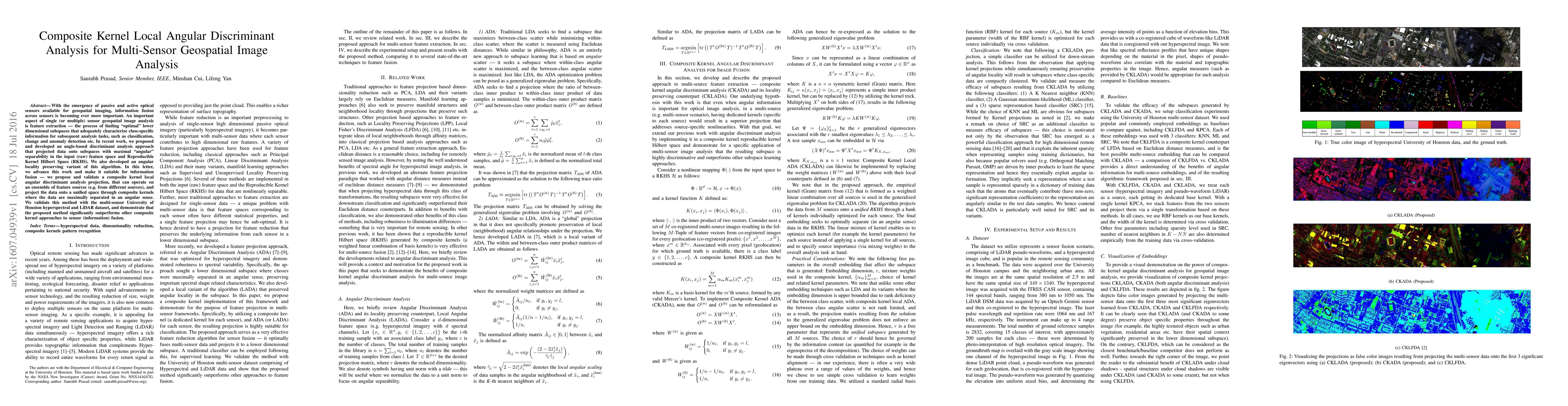 This paper proposes a new method for multi-sensor geospatial image analysis that combines multiple feature sources into a unified space using composite kernels, achieving better performance than existing methods.
