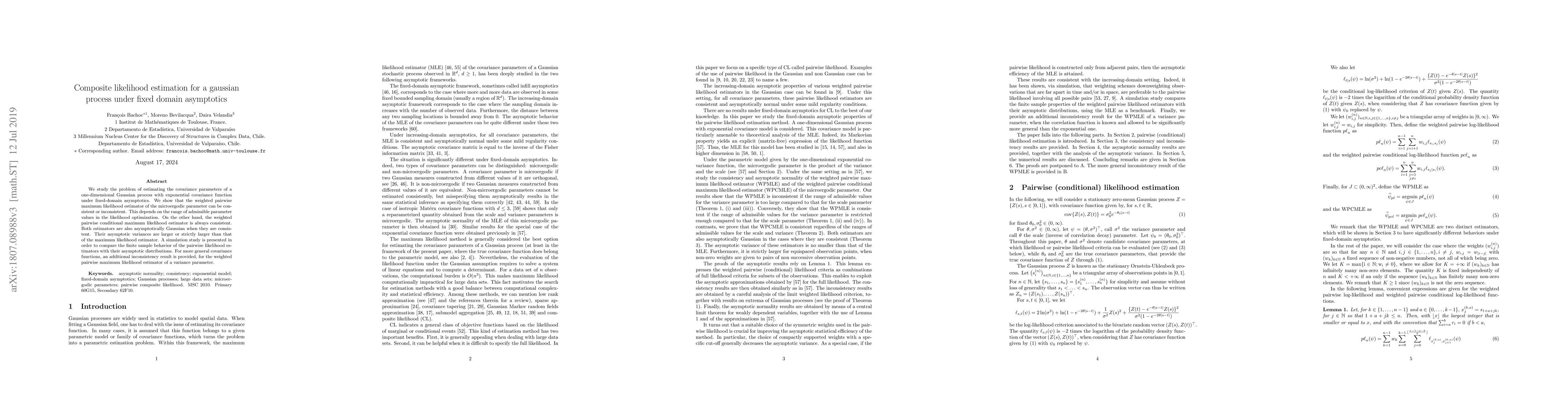 This paper investigates the estimation of covariance parameters in a one-dimensional Gaussian process under fixed-domain asymptotics, showing that while the weighted pairwise maximum likelihood estimator can be inconsistent, the weighted pairwise conditional maximum likelihood estimator is always consistent. Both estimators exhibit asymptotic Gaussianity when consistent, with larger asymptotic variances compared to the maximum likelihood estimator.