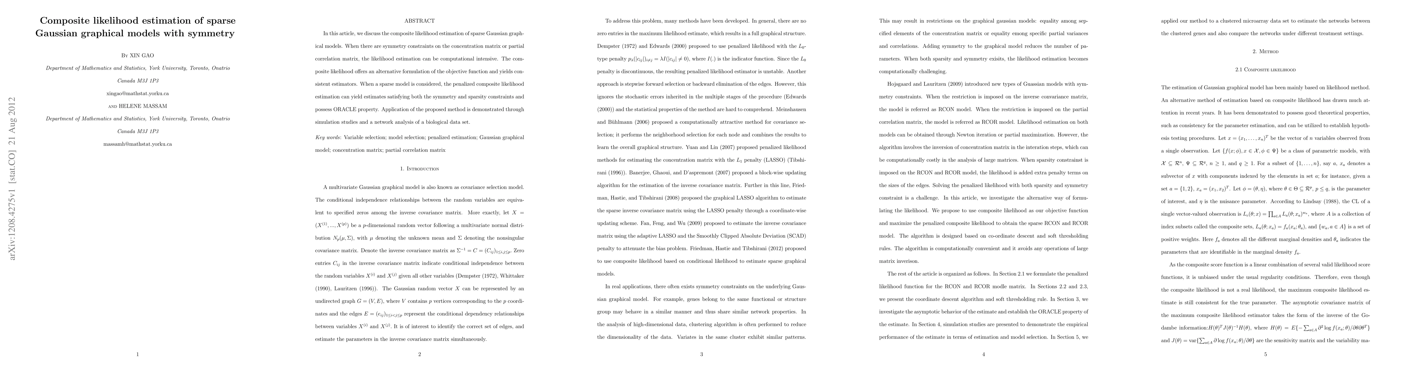 In this article, we discuss the composite likelihood estimation of sparse Gaussian graphical models. When there are symmetry constraints on the concentration matrix or partial correlation matrix, the likelihood estimation can be computational intensive. The composite likelihood offers an alternative formulation of the objective function and yields consistent estimators. When a sparse model is considered, the penalized composite likelihood estimation can yield estimates satisfying both the symmetry and sparsity constraints and possess ORACLE property. Application of the proposed method is demonstrated through simulation studies and a network analysis of a biological data set.