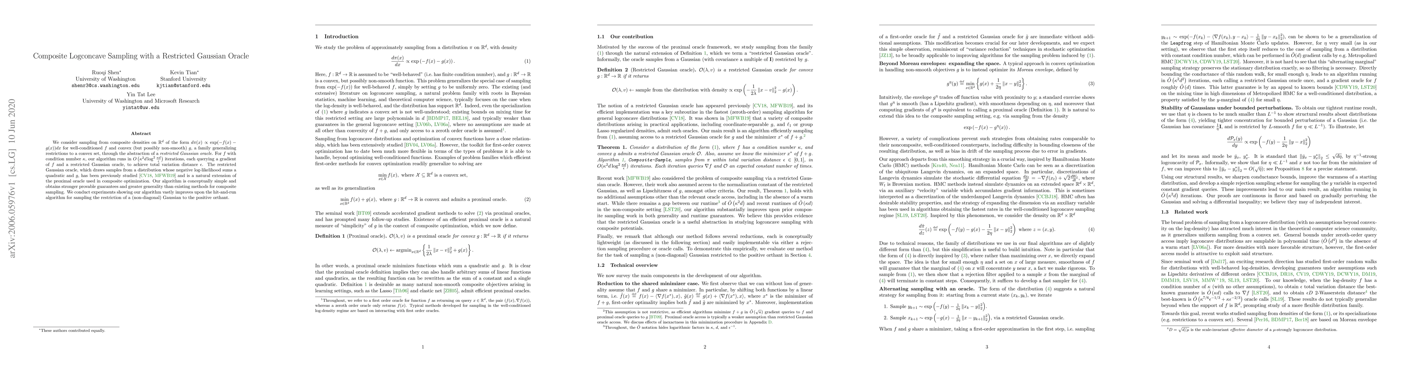 We consider sampling from composite densities on $\mathbb{R}^d$ of the form $d\pi(x) \propto \exp(-f(x) - g(x))dx$ for well-conditioned $f$ and convex (but possibly non-smooth) $g$, a family generalizing restrictions to a convex set, through the abstraction of a restricted Gaussian oracle. For $f$ with condition number $\kappa$, our algorithm runs in $O \left(\kappa^2 d \log^2\tfrac{\kappa d}{\epsilon}\right)$ iterations, each querying a gradient of $f$ and a restricted Gaussian oracle, to achieve total variation distance $\epsilon$. The restricted Gaussian oracle, which draws samples from a distribution whose negative log-likelihood sums a quadratic and $g$, has been previously studied and is a natural extension of the proximal oracle used in composite optimization. Our algorithm is conceptually simple and obtains stronger provable guarantees and greater generality than existing methods for composite sampling. We conduct experiments showing our algorithm vastly improves upon the hit-and-run algorithm for sampling the restriction of a (non-diagonal) Gaussian to the positive orthant.