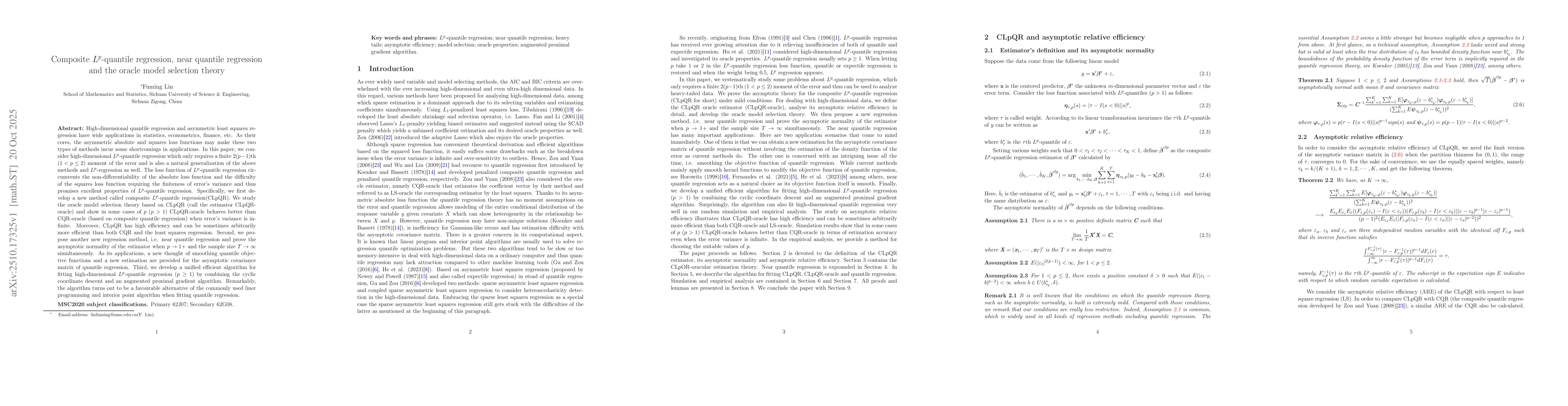 In this paper, we consider high-dimensional Lp-quantile regression which only requires a low order moment of the error and is also a natural generalization of the above methods and Lp-regression as well. The loss function of Lp-quantile regression circumvents the non-differentiability of the absolute loss function and the difficulty of the squares loss function requiring the finiteness of error's variance and thus promises excellent properties of Lp-quantile regression. Specifically, we first develop a new method called composite Lp-quantile regression(CLpQR). We study the oracle model selection theory based on CLpQR (call the estimator CLpQR-oracle) and show in some cases of p CLpQR-oracle behaves better than CQR-oracle (based on composite quantile regression) when error's variance is infinite. Moreover, CLpQR has high efficiency and can be sometimes arbitrarily more efficient than both CQR and the least squares regression. Second, we propose another new regression method,i.e. near quantile regression and prove the asymptotic normality of the estimator when p converges to 1 and the sample size infinity simultaneously. As its applications, a new thought of smoothing quantile objective functions and a new estimation are provided for the asymptotic covariance matrix of quantile regression. Third, we develop a unified efficient algorithm for fitting high-dimensional Lp-quantile regression by combining the cyclic coordinate descent and an augmented proximal gradient algorithm. Remarkably, the algorithm turns out to be a favourable alternative of the commonly used liner programming and interior point algorithm when fitting quantile regression.