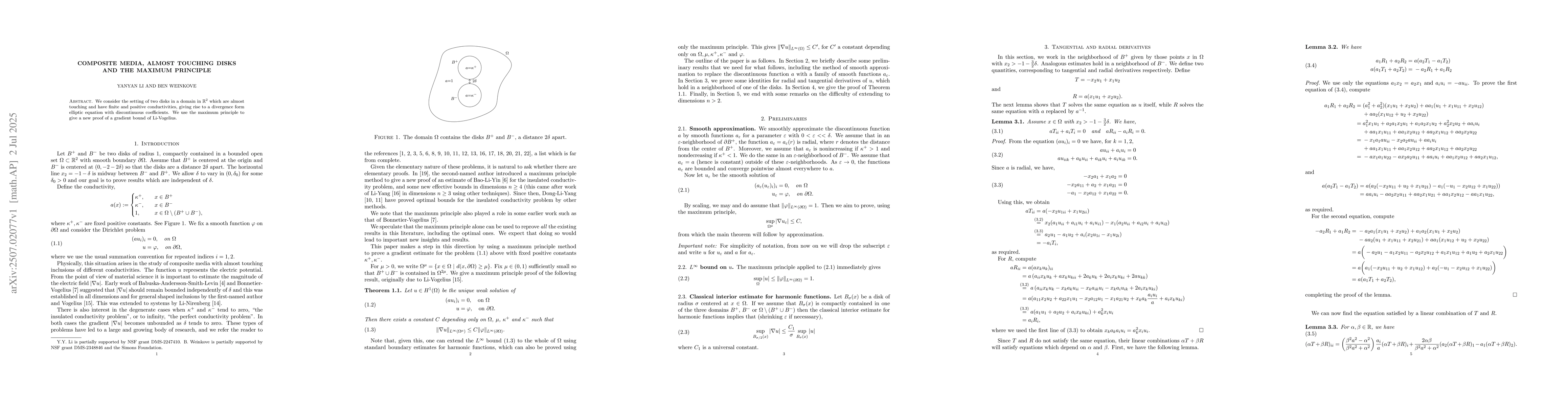 We consider the setting of two disks in a domain in $\mathbb{R}^2$ which are almost touching and have finite and positive conductivities, giving rise to a divergence form elliptic equation with discontinuous coefficients. We use the maximum principle to give a new proof of a gradient bound of Li-Vogelius.