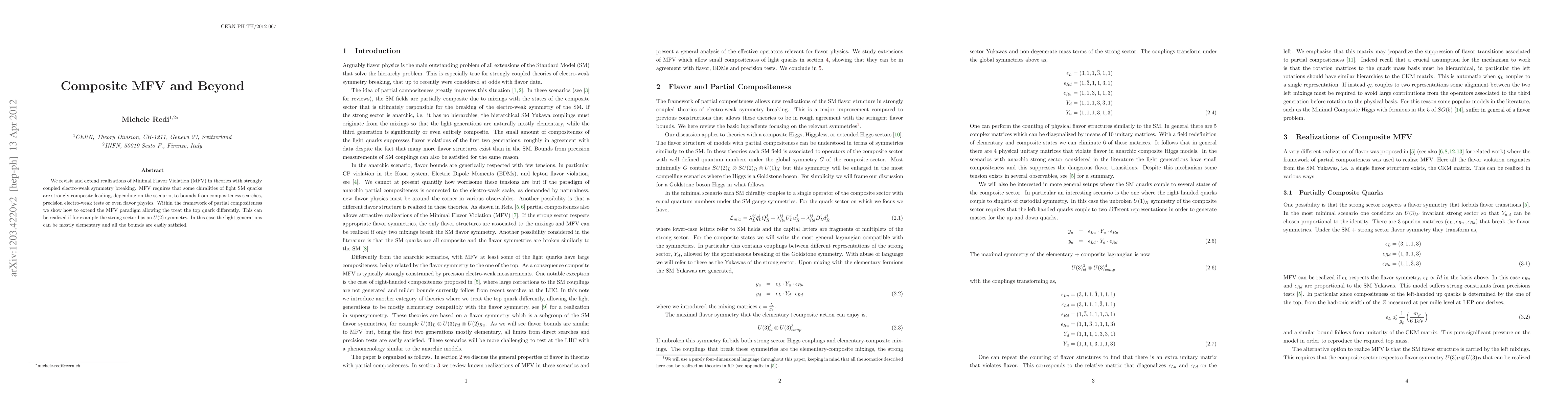 We revisit and extend realizations of Minimal Flavor Violation (MFV) in theories with strongly coupled electro-weak symmetry breaking. MFV requires that some chiralities of light SM quarks are strongly composite leading, depending on the scenario, to bounds from compositeness searches, precision electro-weak tests or even flavor physics. Within the framework of partial compositeness we show how to extend the MFV paradigm allowing the treat the top quark differently. This can be realized if for example the strong sector has an U(2) symmetry. In this case the light generations can be mostly elementary and all the bounds are easily satisfied.