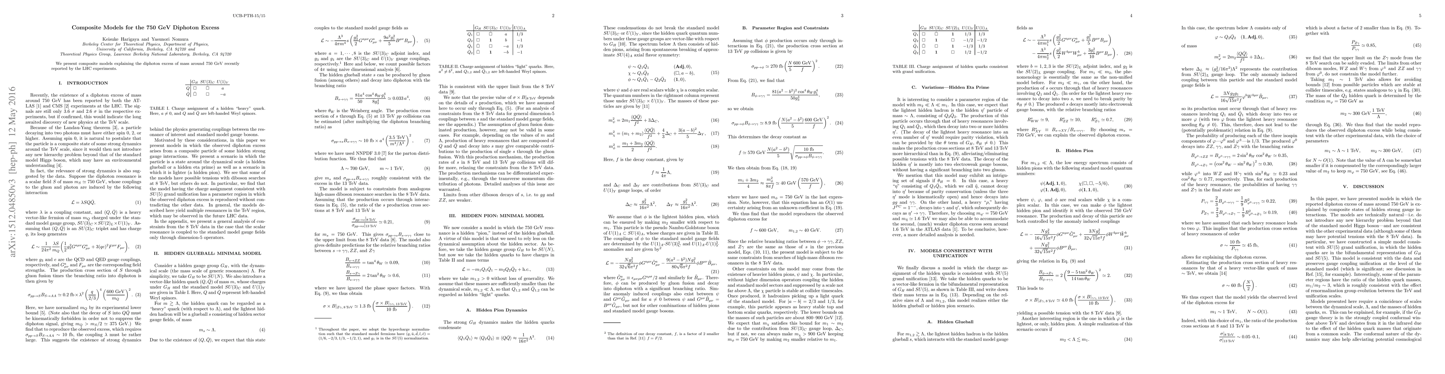 The paper introduces composite models for the 750 GeV diphoton excess, utilizing hidden glueballs and pions, while preserving gauge coupling unification at the Standard Model level.