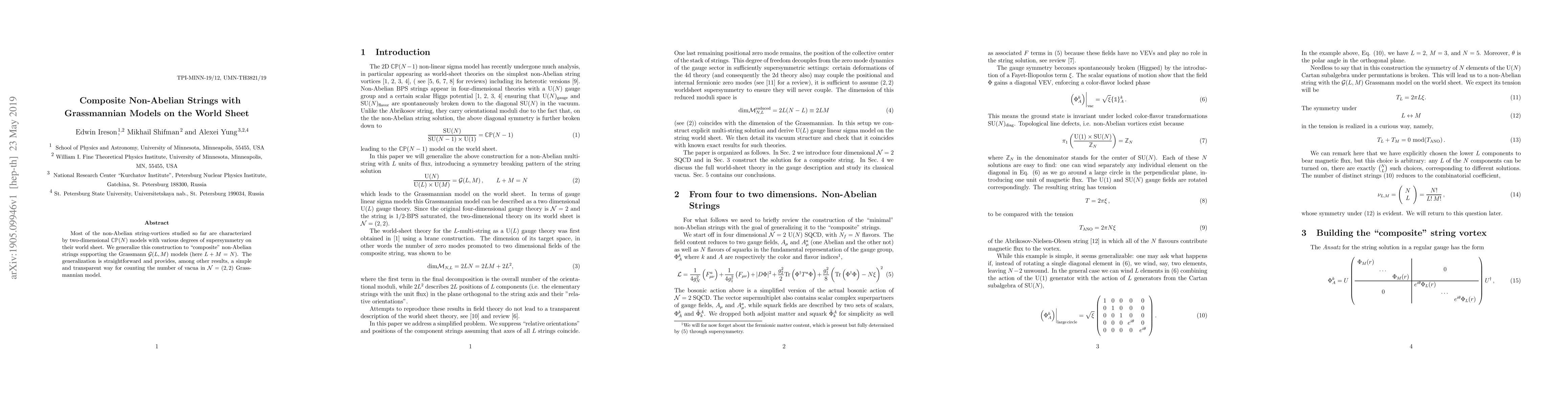 Most of the non-Abelian string-vortices studied so far are characterized by two-dimensional \cpn models with various degrees of supersymmetry on their world sheet. We generalize this construction to "composite" non-Abelian strings supporting the Grassmann $\mathcal{G}(L,M)$ models (here $L+M=N$). The generalization is straightforward and provides, among other results, a simple and transparent way for counting the number of vacua in ${\mathcal N}=(2,2)$ Grassmannian model.