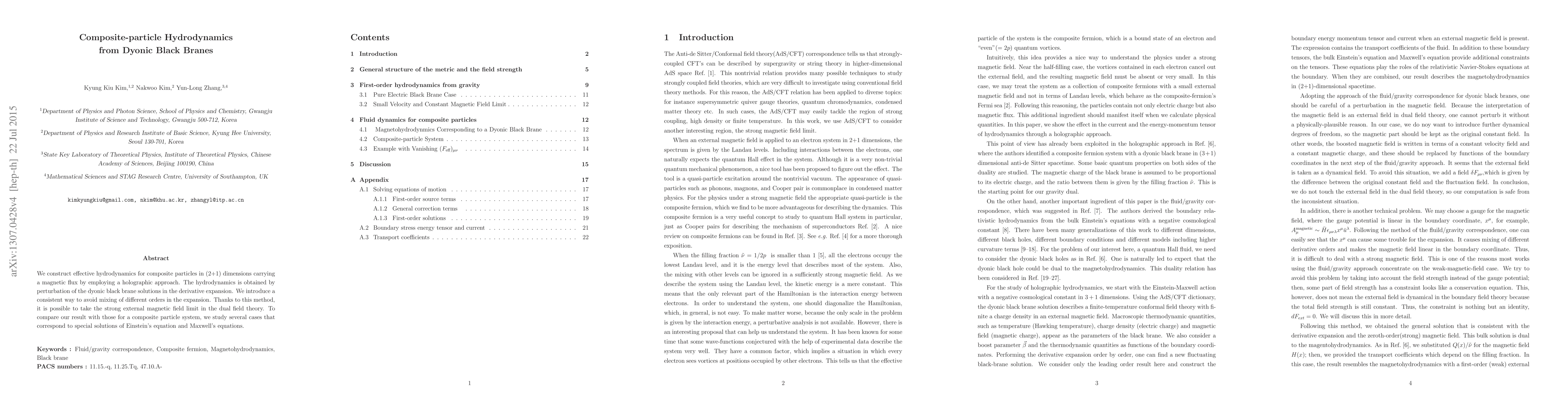 We construct effective hydrodynamics for composite particles in (2+1) dimensions carrying a magnetic flux by employing a holographic approach. The hydrodynamics is obtained by perturbation of the dyonic black brane solutions in the derivative expansion. We introduce a consistent way to avoid mixing of different orders in the expansion. Thanks to this method, it is possible to take the strong external magnetic field limit in the dual field theory. To compare our result with those for a composite particle system, we study several cases that correspond to special solutions of Einstein's equation and Maxwell's equations.