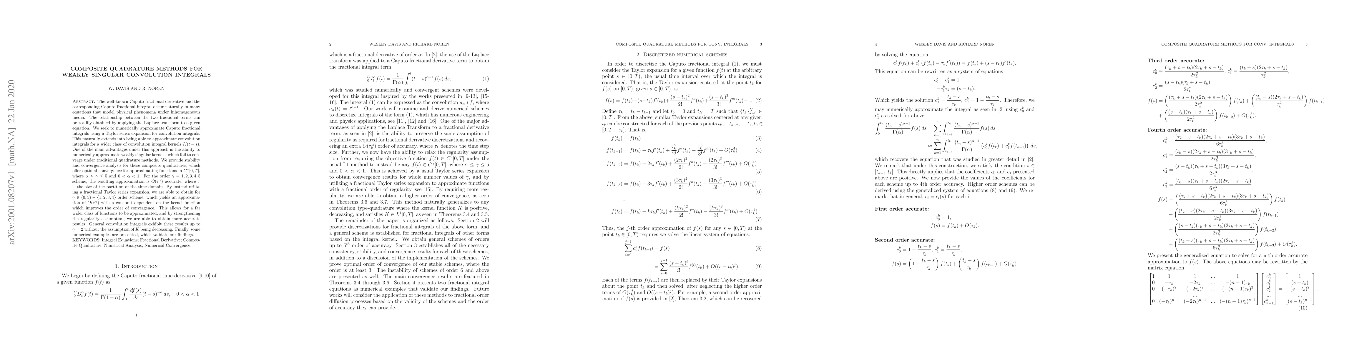 The well-known Caputo fractional derivative and the corresponding Caputo fractional integral occur naturally in many equations that model physical phenomena under inhomogeneous media. The relationship between the two fractional terms can be readily obtained by applying the Laplace transform to a given equation. We seek to numerically approximate Caputo fractional integrals using a Taylor series expansion for convolution integrals. This naturally extends into being able to approximate convolution integrals for a wider class of convolution integral kernels $K(t-s)$. One of the main advantages under this approach is the ability to numerically approximate weakly singular kernels, which fail to converge under traditional quadrature methods. We provide stability and convergence analysis for these composite quadratures, which offer optimal convergence for approximating functions in $C^{\gamma}[0,T]$, where $\alpha \leq \gamma \leq 5$ and $0<\alpha < 1$. For the order $\gamma = 1,2,3,4,5$ scheme, the resulting approximation is $O(\tau^{\gamma})$ accurate, where $\tau$ is the size of the partition of the time domain. By instead utilizing a fractional Taylor series expansion, we are able to obtain for $\gamma \in (0,5)-\{1,2,3,4\}$ order scheme, which yields an approximation of $O(\tau^{\gamma})$ with a constant dependent on the kernel function which improves the order of convergence. This allows for a far wider class of functions to be approximated, and by strengthening the regularity assumption, we are able to obtain more accurate results. General convolution integrals exhibit these results up to $\gamma = 2$ without the assumption of $K$ being decreasing. Finally, some numerical examples are presented, which validate our findings.