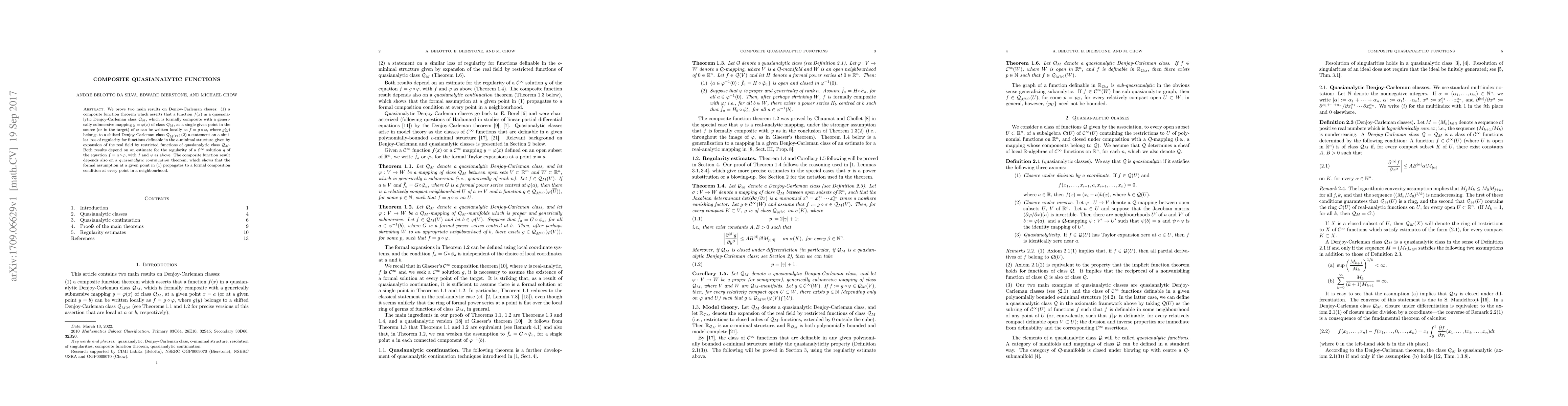 We prove two main results on Denjoy-Carleman classes: (1) a composite function theorem which asserts that a function f(x) in a quasianalytic Denjoy-Carleman class Q, which is formally composite with a generically submersive mapping y=h(x) of class Q, at a single given point in the source (or in the target) of h, can be written locally as f(x) = g(h(x)), where g(y) belongs to a shifted Denjoy-Carleman class Q' ; (2) a statement on a similar loss of regularity for functions definable in the o-minimal structure given by expansion of the real field by restricted functions of quasianalytic class Q. Both results depend on an estimate for the regularity of an infinitely differentiable solution g of the equation f(x) = g(h(x)), with f and h as above. The composite function result depends also on a quasianalytic continuation theorem, which shows that the formal assumption at a given point in (1) propagates to a formal composition condition at every point in a neighbourhood.