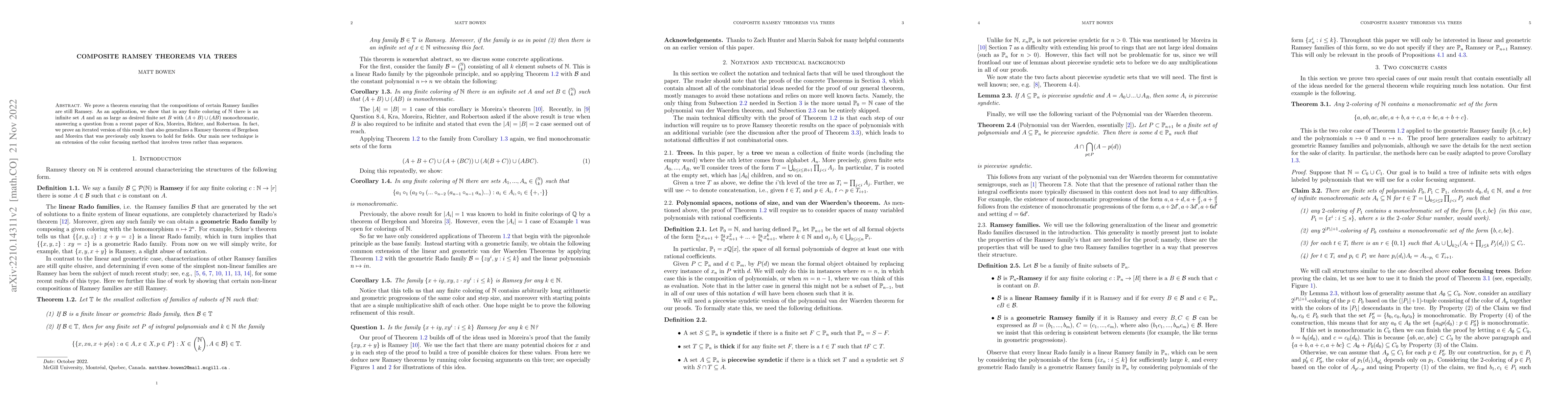 The paper proves a composite Ramsey theorem using an extended color focusing method involving trees, showing that certain Ramsey families retain their Ramsey properties under composition. It demonstrates the existence of monochromatic sets under finite colorings of natural numbers, addressing a question posed in a recent work by Kra et al.