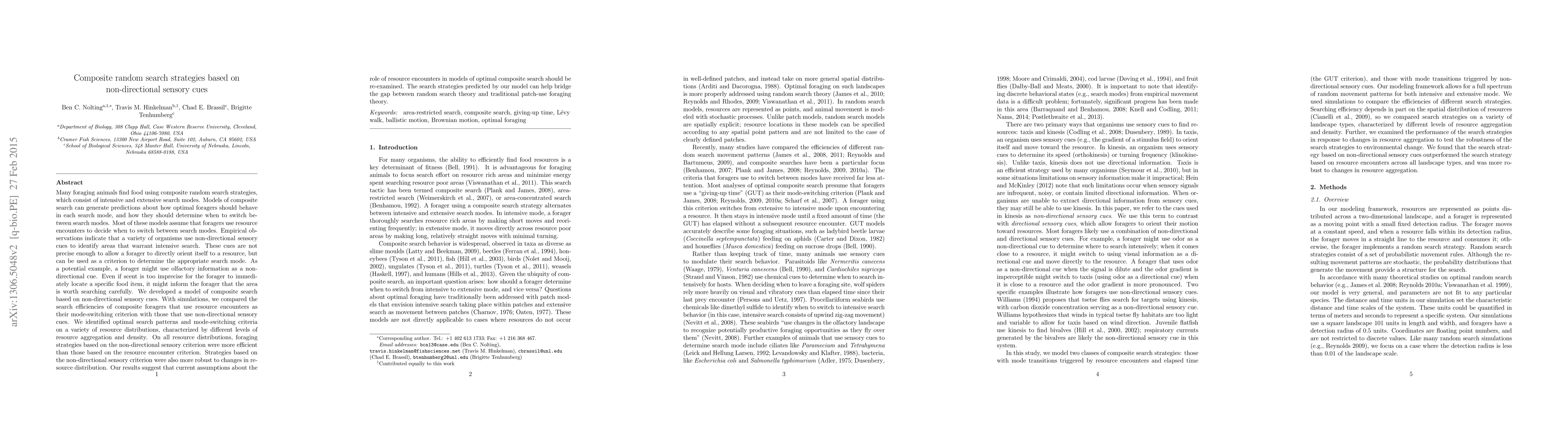 Foraging animals using composite random search strategies were found to be more efficient when relying on non-directional sensory cues than resource encounters for mode-switching, suggesting a re-evaluation of assumptions in optimal composite search models.