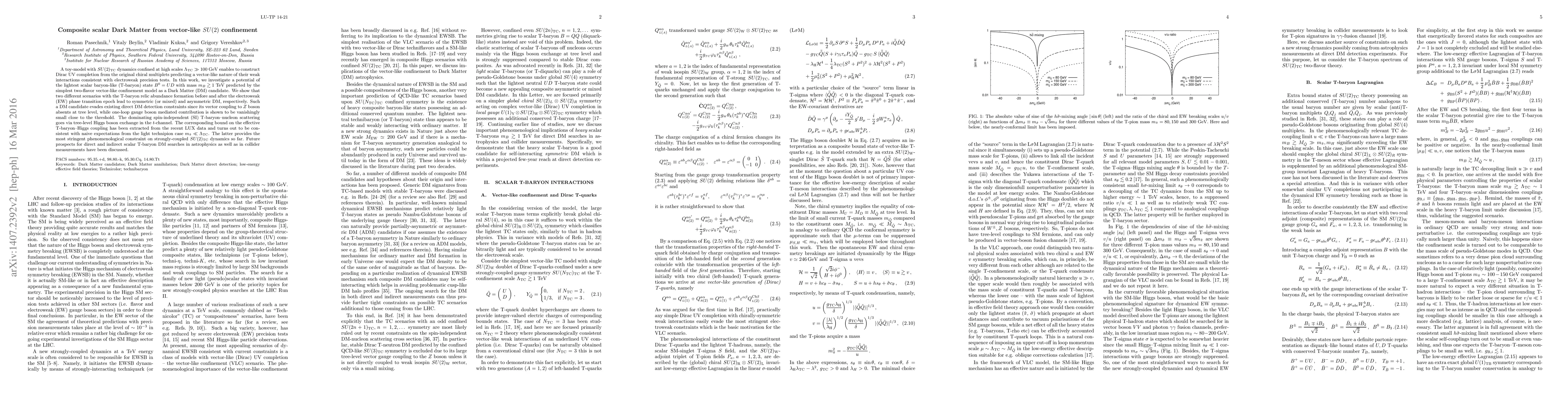 A toy-model with $SU(2)_{\rm TC}$ dynamics confined at high scales $\Lambda_{\rm TC}\gg 100$ GeV enables to construct Dirac UV completion from the original chiral multiplets predicting a vector-like nature of their weak interactions consistent with electroweak precision tests. In this work, we investigate a potential of the lightest scalar baryon-like (T-baryon) state $B^0=UD$ with mass $m_B\gtrsim 1$ TeV predicted by the simplest two-flavor vector-like confinement model as a Dark Matter (DM) candidate. We show that two different scenarios with the T-baryon relic abundance formation before and after the electroweak (EW) phase transition epoch lead to symmetric (or mixed) and asymmetric DM, respectively. Such a DM candidate evades existing direct DM detection constraints since its vector coupling to $Z$ boson absents at tree level, while one-loop gauge boson mediated contribution is shown to be vanishingly small close to the threshold. The dominating spin-independent (SI) T-baryon--nucleon scattering goes via tree-level Higgs boson exchange in the $t$-channel. The corresponding bound on the effective T-baryon--Higgs coupling has been extracted from the recent LUX data and turns out to be consistent with naive expectations from the light technipion case $m_{\tilde \pi}\ll \Lambda_{\rm TC}$. The latter provides the most stringent phenomenological constraint on strongly-coupled $SU(2)_{\rm TC}$ dynamics so far. Future prospects for direct and indirect scalar T-baryon DM searches in astrophysics as well as in collider measurements have been discussed.