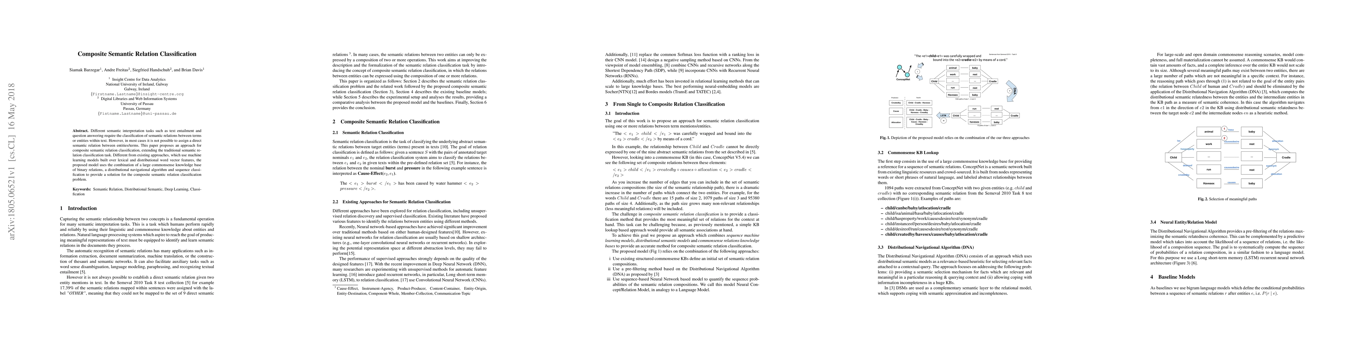 This paper proposes a novel approach for composite semantic relation classification, combining a commonsense knowledge base, a distributional navigational algorithm, and sequence classification, to address the challenge of indirect semantic relations in text. Unlike existing methods, it leverages a hybrid model that transcends traditional machine learning models based on word vectors.