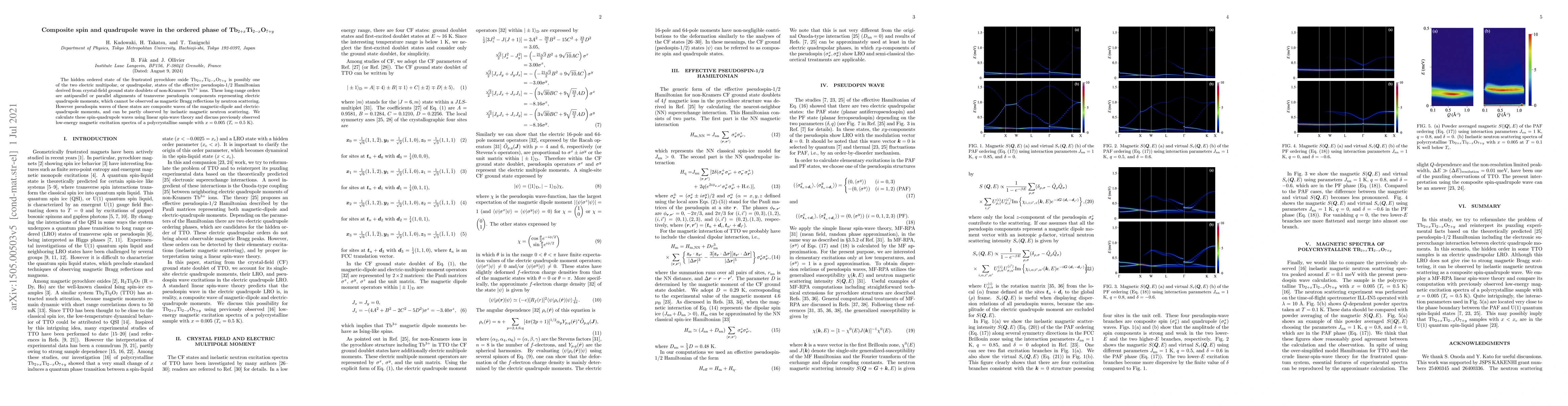 This paper explores the hidden ordered state in Tb$_{2+x}$Ti$_{2-x}$O$_{7+y}$ pyrochlore oxide, revealing composite spin and quadrupole waves in its effective pseudospin-1/2 Hamiltonian. The study uses linear spin-wave theory to calculate these waves, which are observable via inelastic magnetic neutron scattering, and correlates findings with low-energy magnetic excitation spectra.