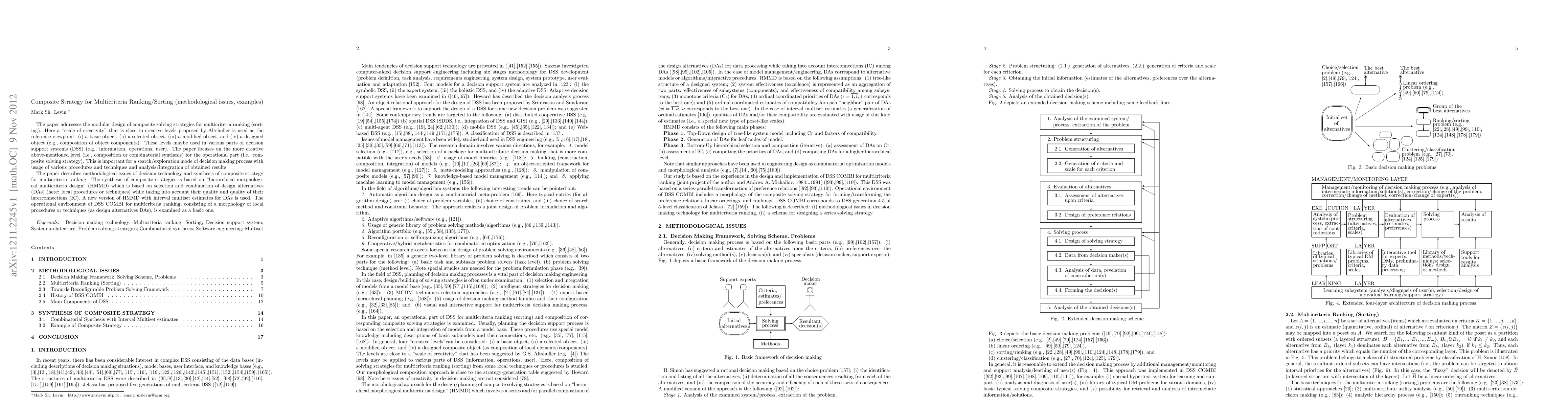 The paper addresses the modular design of composite solving strategies for multicriteria ranking (sorting). Here a 'scale of creativity' that is close to creative levels proposed by Altshuller is used as the reference viewpoint: (i) a basic object, (ii) a selected object, (iii) a modified object, and (iv) a designed object (e.g., composition of object components). These levels maybe used in various parts of decision support systems (DSS) (e.g., information, operations, user). The paper focuses on the more creative above-mentioned level (i.e., composition or combinatorial synthesis) for the operational part (i.e., composite solving strategy). This is important for a search/exploration mode of decision making process with usage of various procedures and techniques and analysis/integration of obtained results. The paper describes methodological issues of decision technology and synthesis of composite strategy for multicriteria ranking. The synthesis of composite strategies is based on 'hierarchical morphological multicriteria design' (HMMD) which is based on selection and combination of design alternatives (DAs) (here: local procedures or techniques) while taking into account their quality and quality of their interconnections (IC). A new version of HMMD with interval multiset estimates for DAs is used. The operational environment of DSS COMBI for multicriteria ranking, consisting of a morphology of local procedures or techniques (as design alternatives DAs), is examined as a basic one.