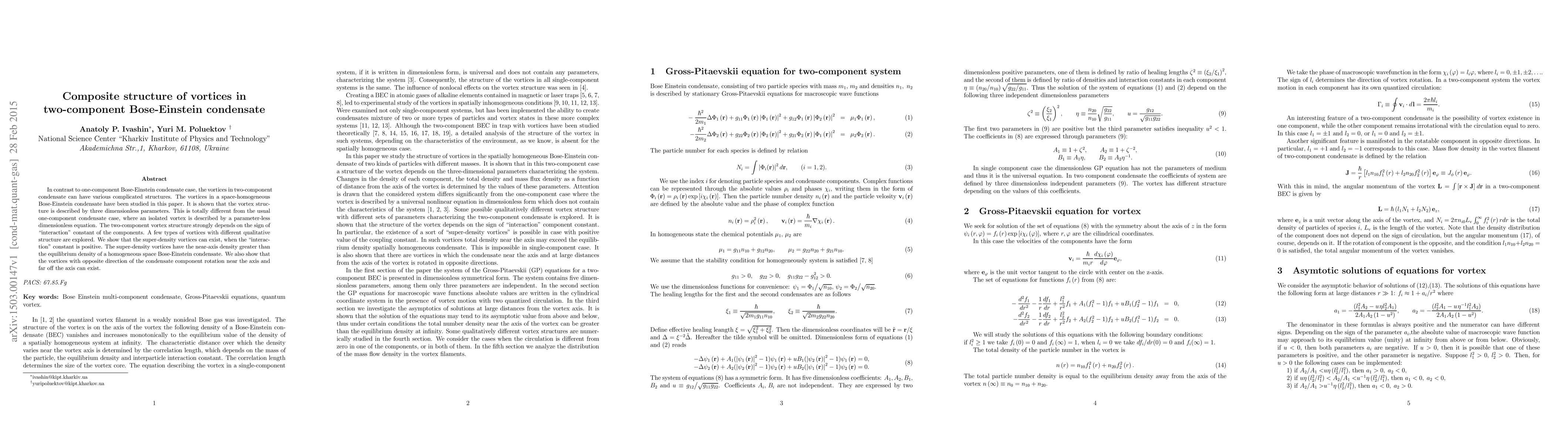 This paper investigates the complex vortex structures in two-component Bose-Einstein condensates, which are described by three dimensionless parameters unlike the parameter-less description of one-component condensates. The study explores various vortex types, including super-density vortices when the interaction constant is positive.