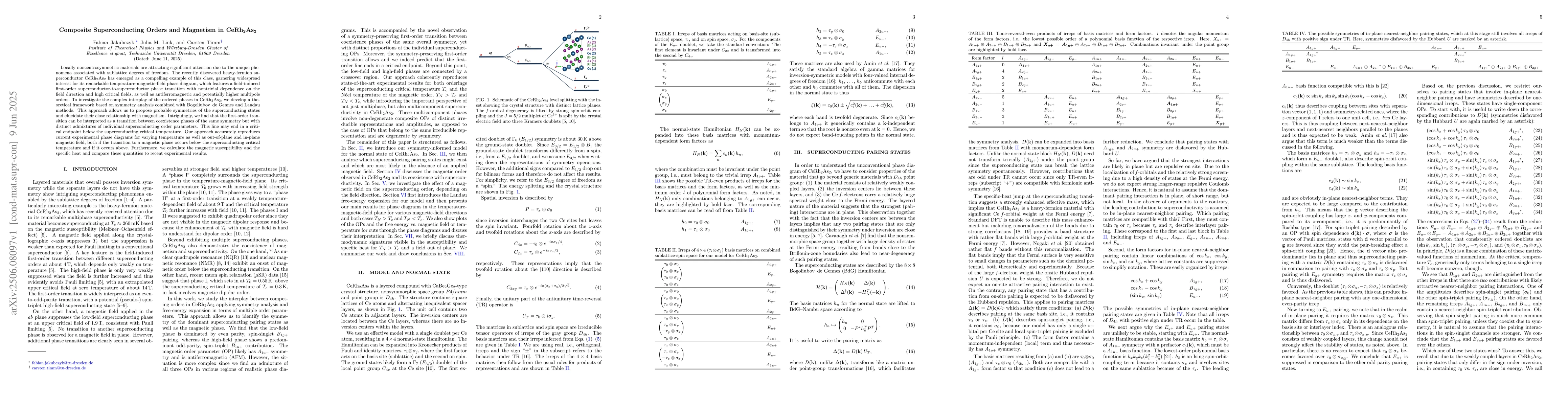 Locally noncentrosymmetric materials are attracting significant attention due to the unique phenomena associated with sublattice degrees of freedom. The recently discovered heavy-fermion superconductor CeRh$_2$As$_2$ has emerged as a compelling example of this class, garnering widespread interest for its remarkable temperature-magnetic-field phase diagram, which features a field-induced first-order superconductor-to-superconductor phase transition with nontrivial dependence on the field direction and high critical fields, as well as antiferromagnetic and potentially higher multipole orders. To investigate the complex interplay of the ordered phases in CeRh$_2$As$_2$, we develop a theoretical framework based on symmetry analysis combined with Bogoliubov--de Gennes and Landau methods. This approach allows us to propose probable symmetries of the superconducting states and elucidate their close relationship with magnetism. Intriguingly, we find that the first-order transition can be interpreted as a transition between coexistence phases of the same symmetry but with distinct admixtures of individual superconducting order parameters. This line may end in a critical endpoint below the superconducting critical temperature. Our approach accurately reproduces current experimental phase diagrams for varying temperature as well as out-of-plane and in-plane magnetic field, both if the transition to a magnetic phase occurs below the superconducting critical temperature and if it occurs above. Furthermore, we calculate the magnetic susceptibility and the specific heat and compare these quantities to recent experimental results.