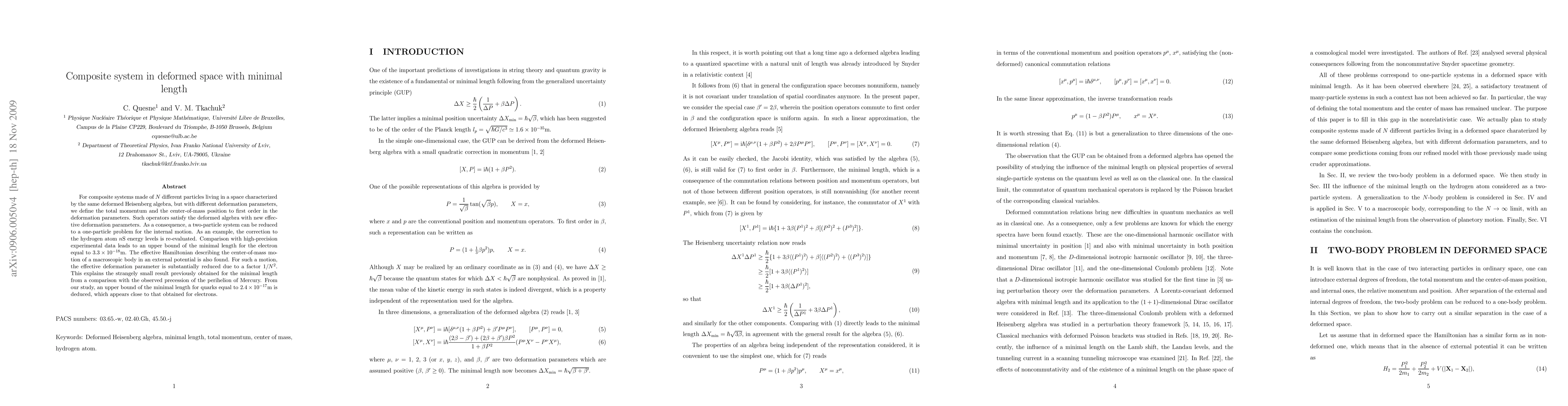 This paper explores composite systems in deformed space with minimal length, defining total momentum and center-of-mass position for particles with different deformation parameters. It finds that a two-particle system can be simplified to a one-particle problem, leading to new effective deformation parameters and corrections to hydrogen atom energy levels, with an upper bound on the electron's minimal length of $3.3\times 10^{-18} {\rm m}$.
