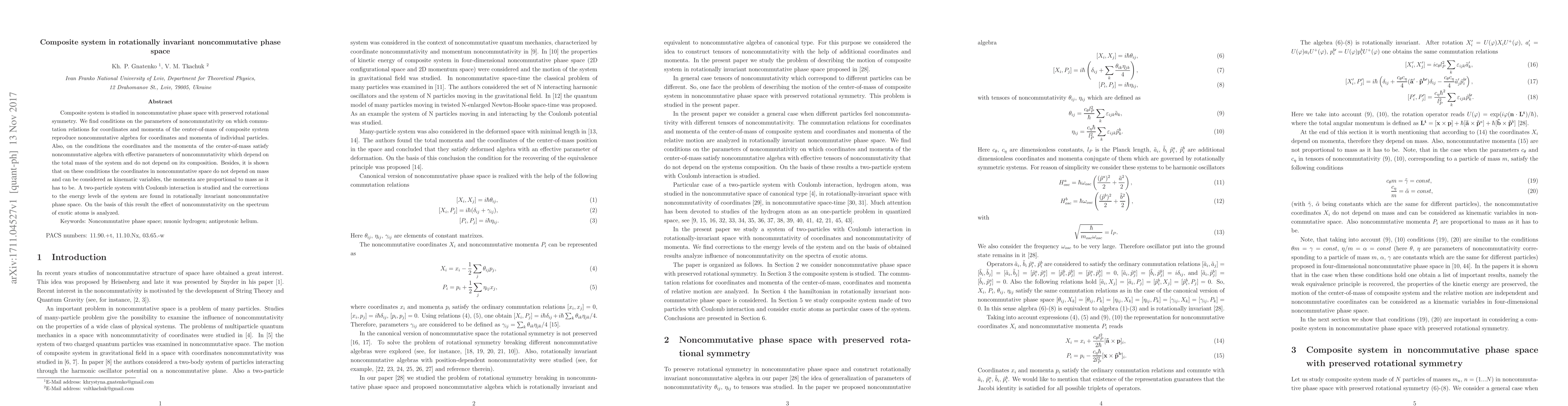 This paper investigates a composite system in a rotationally invariant noncommutative phase space, finding conditions under which the center-of-mass coordinates and momenta reproduce the noncommutative algebra of individual particles. It also analyzes a two-particle system with Coulomb interaction to determine corrections to energy levels and discusses the impact of noncommutativity on exotic atoms.