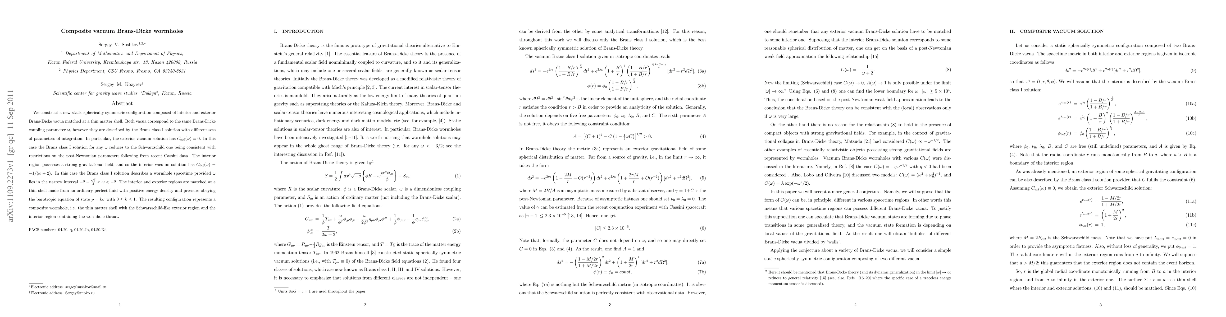 We construct a new static spherically symmetric configuration composed of interior and exterior Brans-Dicke vacua matched at a thin matter shell. Both vacua correspond to the same Brans-Dicke coupling parameter $\omega$, however they are described by the Brans class I solution with different sets of parameters of integration. In particular, the exterior vacuum solution has $C_{ext}(\omega)\equiv 0$. In this case the Brans class I solution for any $\omega$ reduces to the Schwarzschild one being consistent with restrictions on the post-Newtonian parameters following from recent Cassini data. The interior region possesses a strong gravitational field, and so the interior vacuum solution has $C_{int}(\omega)=-1/(\omega+2)$. In this case the Brans class I solution describes a wormhole spacetime provided $\omega$ lies in the narrow interval $-2-\frac{\sqrt{3}}{3}<\omega<-2$. The interior and exterior regions are matched at a thin shell made from an ordinary perfect fluid with positive energy density and pressure obeying the barotropic equation of state $p=k\sigma$ with $0\le k\le1$. The resulting configuration represents a composite wormhole, i.e. the thin matter shell with the Schwarzschild-like exterior region and the interior region containing the wormhole throat.