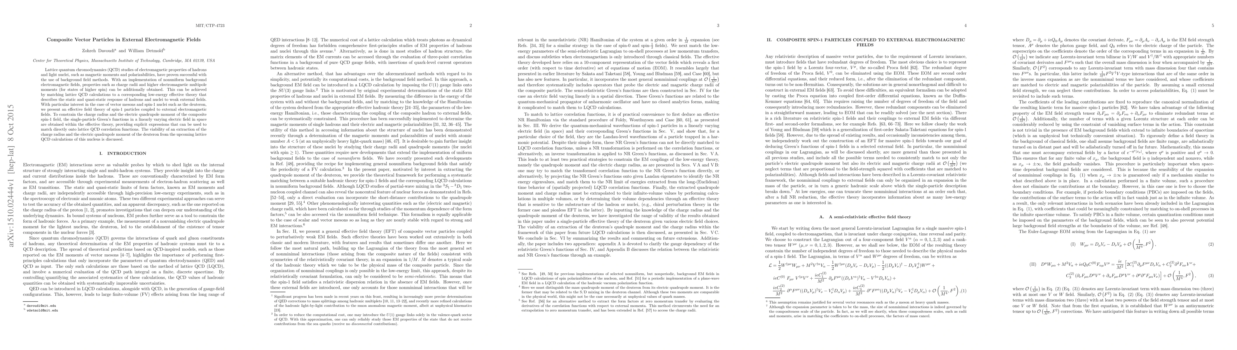 This paper develops an effective field theory for composite vector particles, like vector mesons and spin-1 nuclei, coupled to external electromagnetic fields, aiming to extract charge radii and electric quadrupole moments from lattice QCD calculations. The study provides explicit expressions for single-particle Green's functions in a linearly varying electric field to match lattice QCD results, focusing on the deuteron.