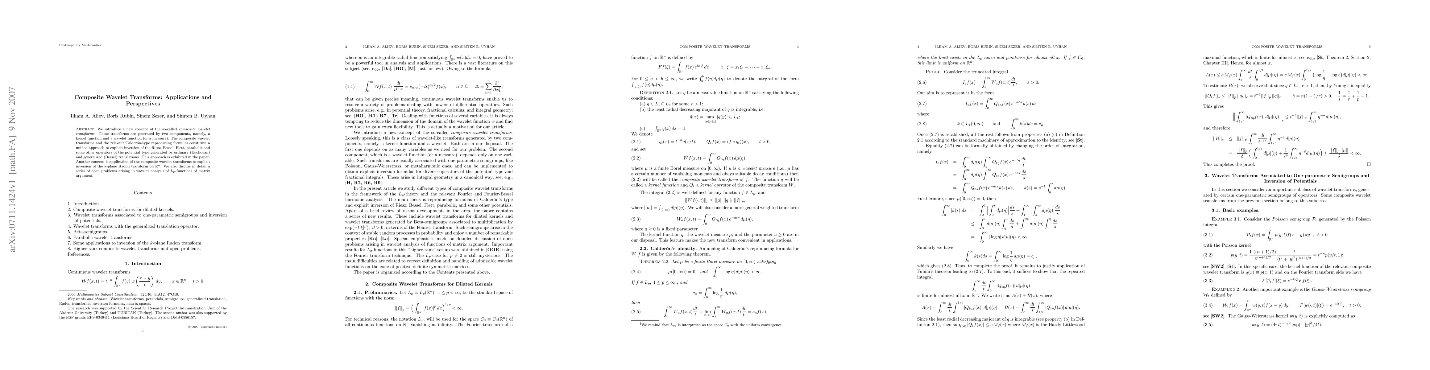 We introduce a new concept of the so-called {\it composite wavelet transforms}. These transforms are generated by two components, namely, a kernel function and a wavelet function (or a measure). The composite wavelet transforms and the relevant Calder\'{o}n-type reproducing formulas constitute a unified approach to explicit inversion of the Riesz, Bessel, Flett, parabolic and some other operators of the potential type generated by ordinary (Euclidean) and generalized (Bessel) translations. This approach is exhibited in the paper. Another concern is application of the composite wavelet transforms to explicit inversion of the k-plane Radon transform on $\bbr^n$. We also discuss in detail a series of open problems arising in wavelet analysis of $L_p$-functions of matrix argument.