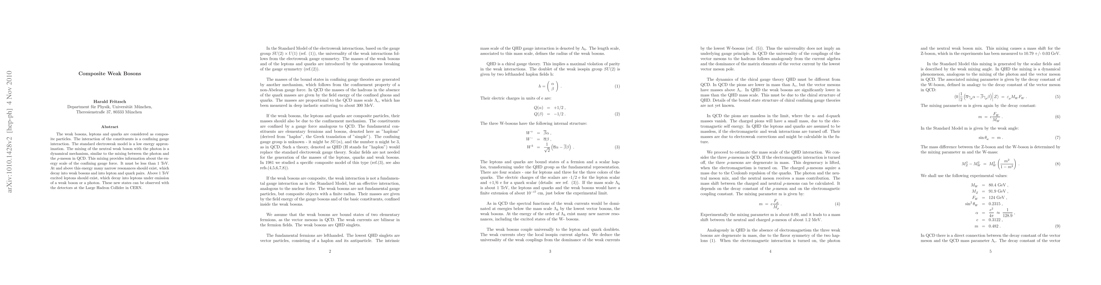 This paper proposes that weak bosons, leptons, and quarks are composite particles held together by a confining gauge interaction. It suggests that the standard electroweak model is a low-energy approximation, and that the mixing of neutral weak bosons with photons indicates an energy scale for the confining force below 1 TeV, where new resonances and excited leptons could be observed at the LHC.