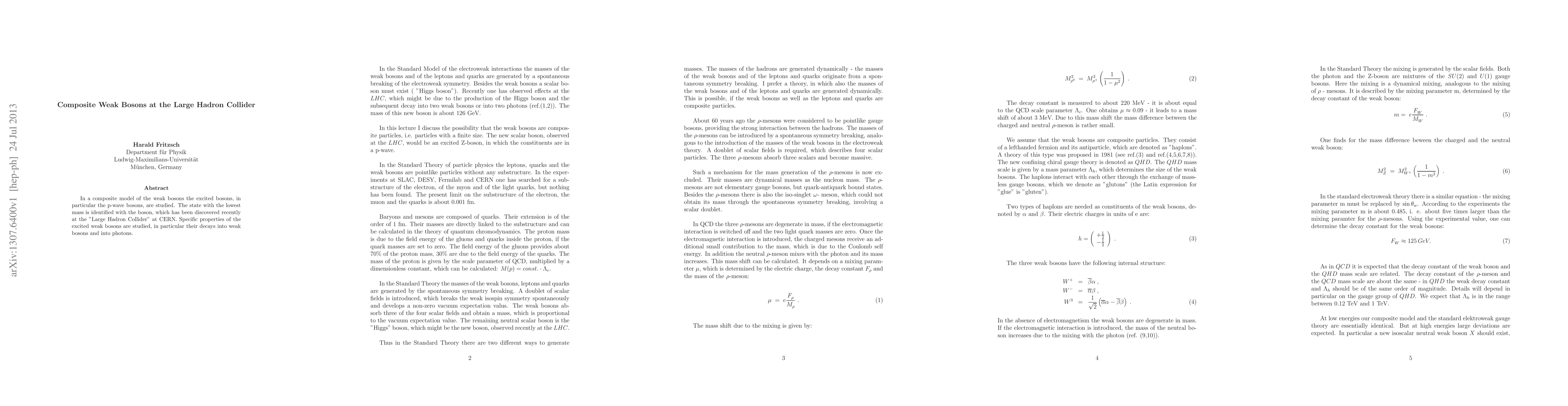 In a composite model of the weak bosons the excited bosons, in particular the p-wave bosons, are studied. The state with the lowest mass is identified with the boson, which has been discovered recently at the "Large Hadron Collider" at CERN. Specific properties of the excited weak bosons are studied, in particular their decays into weak bosons and into photons.