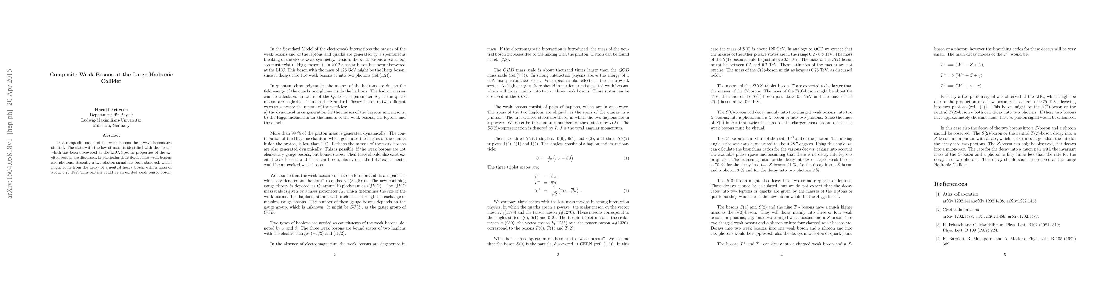 This paper explores a composite model of weak bosons, identifying the lowest mass state as the boson discovered at the LHC. It discusses the properties and decay patterns of excited bosons, particularly their decay into weak bosons and photons, and highlights a recent two-photon signal potentially from the decay of a neutral heavy boson, suggesting it could be an excited weak tensor boson.