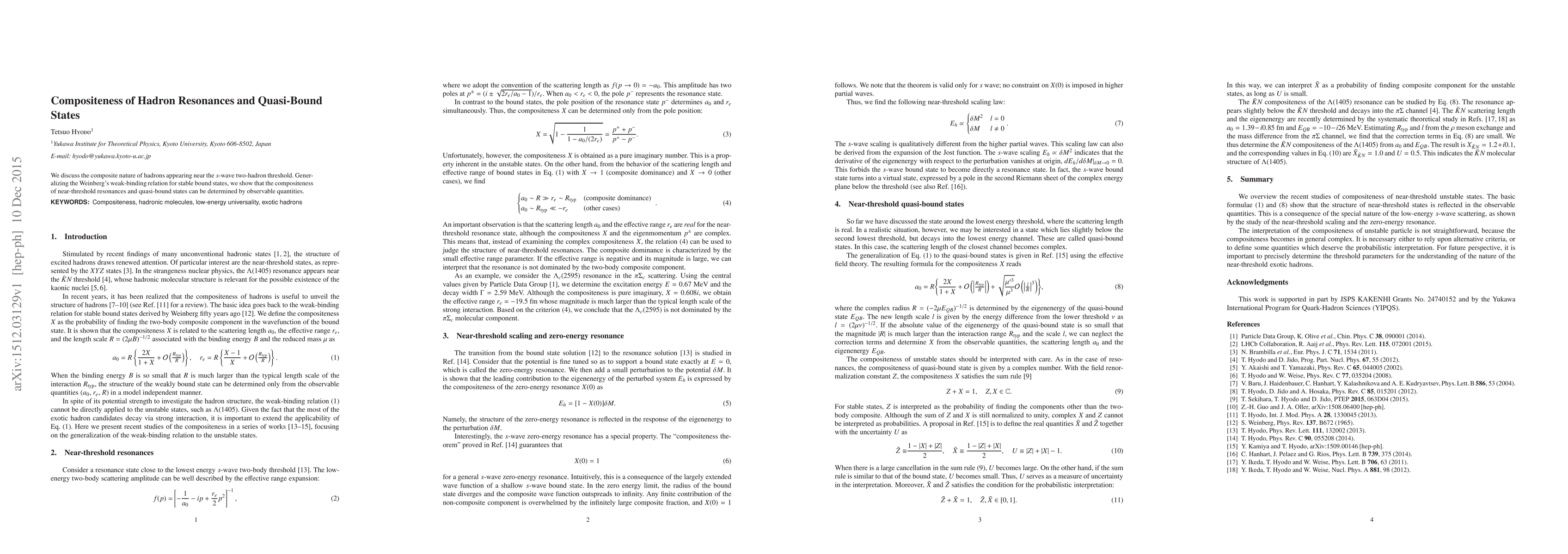 This paper explores the composite nature of hadrons near the s-wave two-hadron threshold, demonstrating that their compositeness can be inferred from observable quantities by generalizing Weinberg's weak-binding relation for stable bound states. The findings reveal the existence of quasi-bound states and near-threshold resonances.