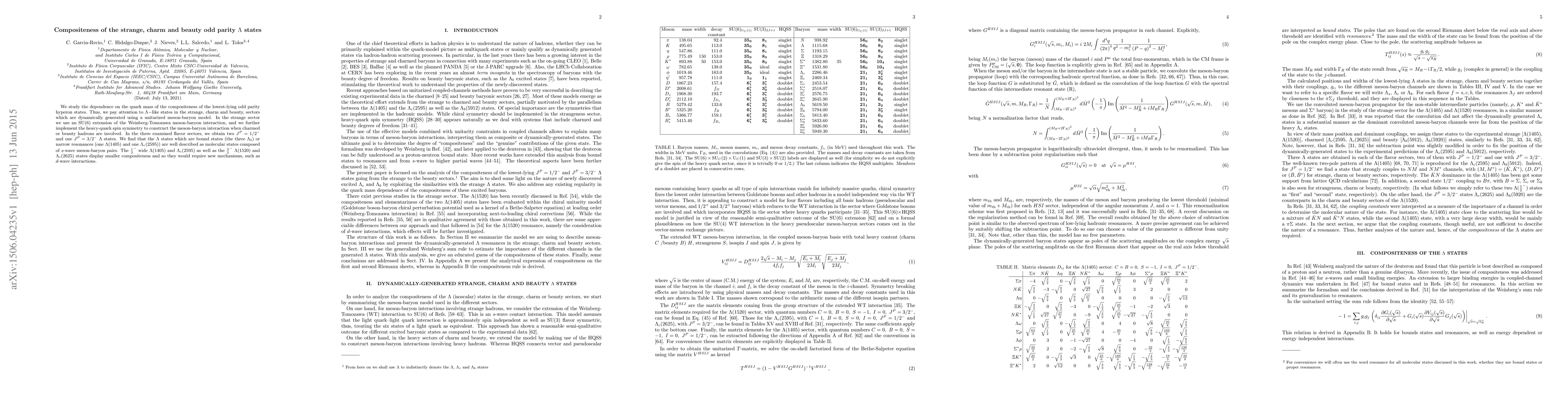 We study the dependence on the quark mass of the compositeness of the lowest-lying odd parity hyperon states. Thus, we pay attention to $\Lambda-$like states in the strange, charm and beauty, sectors which are dynamically generated using a unitarized meson-baryon model. In the strange sector we use an SU(6) extension of the Weinberg-Tomozawa meson-baryon interaction, and we further implement the heavy-quark spin symmetry to construct the meson-baryon interaction when charmed or beauty hadrons are involved. In the three examined flavor sectors, we obtain two $J^P=1/2^-$ and one $J^P=3/2^-$ $\Lambda$ states. We find that the $\Lambda$ states which are bound states (the three $\Lambda_b$) or narrow resonances (one $\Lambda(1405)$ and one $\Lambda_c(2595)$) are well described as molecular states composed of $s$-wave meson-baryon pairs. The $\frac{1}{2}^-$ wide $\Lambda(1405)$ and $\Lambda_c(2595)$ as well as the $\frac{3}{2}^-$ $\Lambda(1520)$ and $\Lambda_c(2625)$ states display smaller compositeness and so they would require new mechanisms, such as $d$-wave interactions.