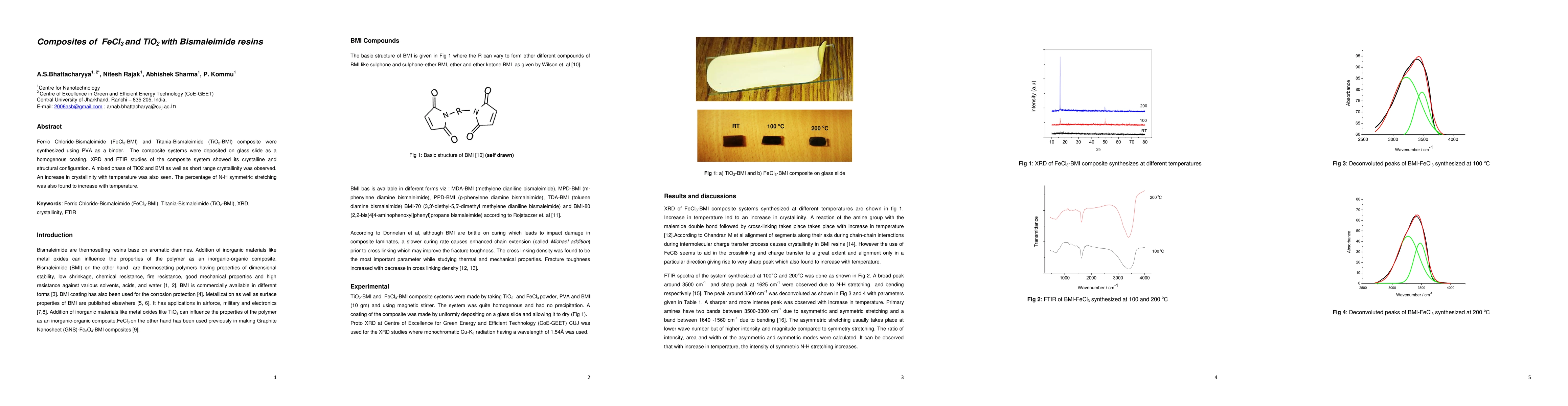Ferric Chloride-Bismaleimide (FeCl3-BMI) and Titania-Bismaleimide (TiO2-BMI) composite were synthesized using PVA as a binder. The composite systems were deposited on glass slide as a homogenous coating. XRD and FTIR studies of the composite system showed its crystalline and structural configuration. A mixed phase of TiO2 and BMI as well as short range crystallinity was observed. An increase in crystallinity with temperature was also seen. The percentage of N-H symmetric stretching was also found to increase with temperature.