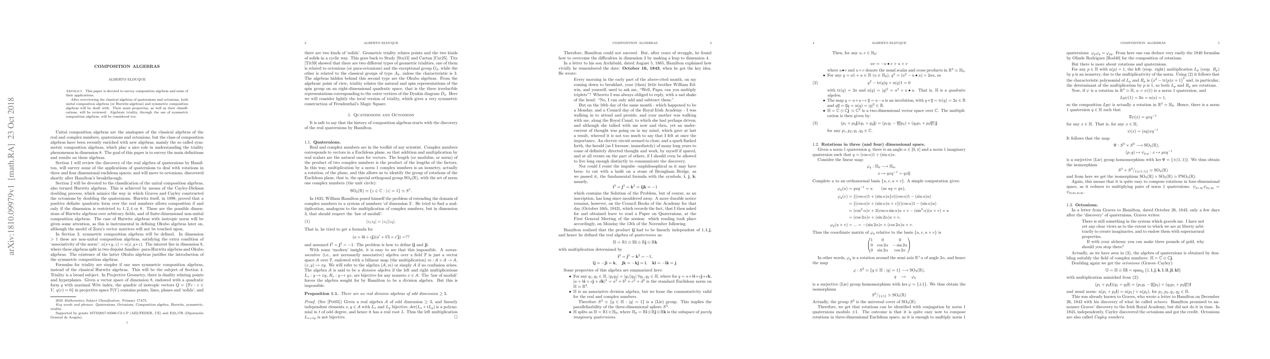 This paper is devoted to survey composition algebras and some of their applications. After overviewing the classical algebras of quaternions and octonions, both unital composition algebras (or Hurwitz algebras) and symmetric composition algebras will be dealt with. Their main properties, as well as their classifications, will be reviewed. Algebraic triality, through the use of symmetric composition algebras, will be considered too.