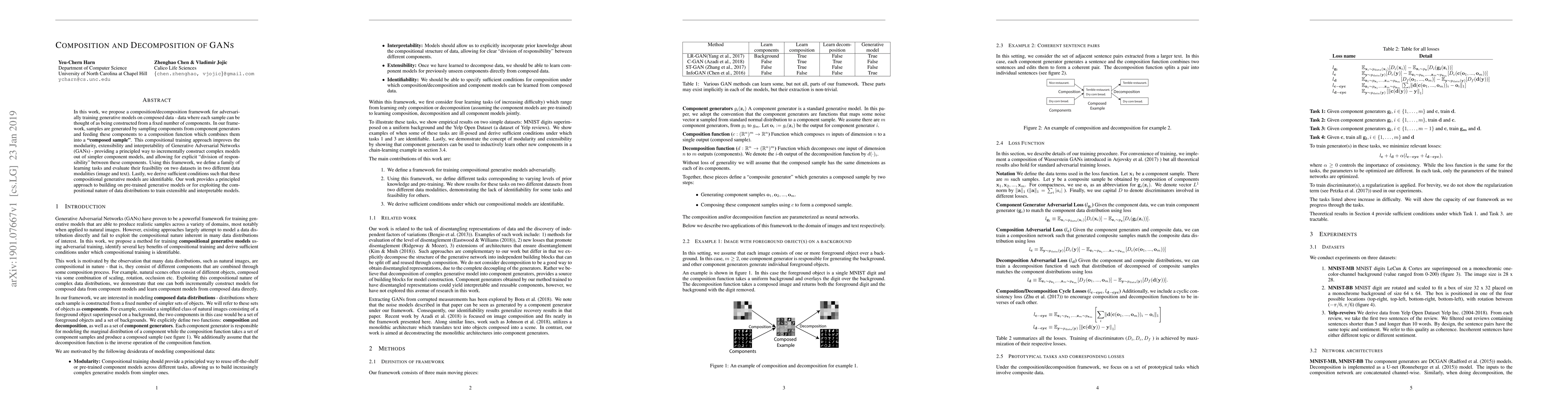 In this work, we propose a composition/decomposition framework for adversarially training generative models on composed data - data where each sample can be thought of as being constructed from a fixed number of components. In our framework, samples are generated by sampling components from component generators and feeding these components to a composition function which combines them into a "composed sample". This compositional training approach improves the modularity, extensibility and interpretability of Generative Adversarial Networks (GANs) - providing a principled way to incrementally construct complex models out of simpler component models, and allowing for explicit "division of responsibility" between these components. Using this framework, we define a family of learning tasks and evaluate their feasibility on two datasets in two different data modalities (image and text). Lastly, we derive sufficient conditions such that these compositional generative models are identifiable. Our work provides a principled approach to building on pre-trained generative models or for exploiting the compositional nature of data distributions to train extensible and interpretable models.