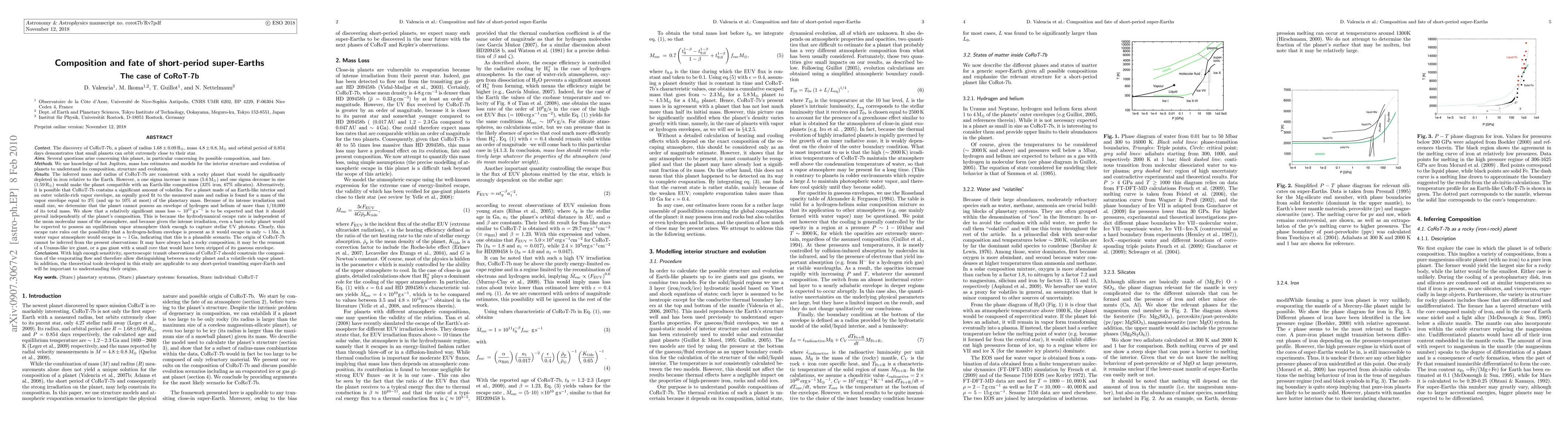 CoRoT-7b, a short-period super-Earth, likely has a rocky composition but could also contain significant volatiles or a thin vapor envelope. Its intense irradiation leads to significant mass loss, ruling out thick hydrogen-helium envelopes.