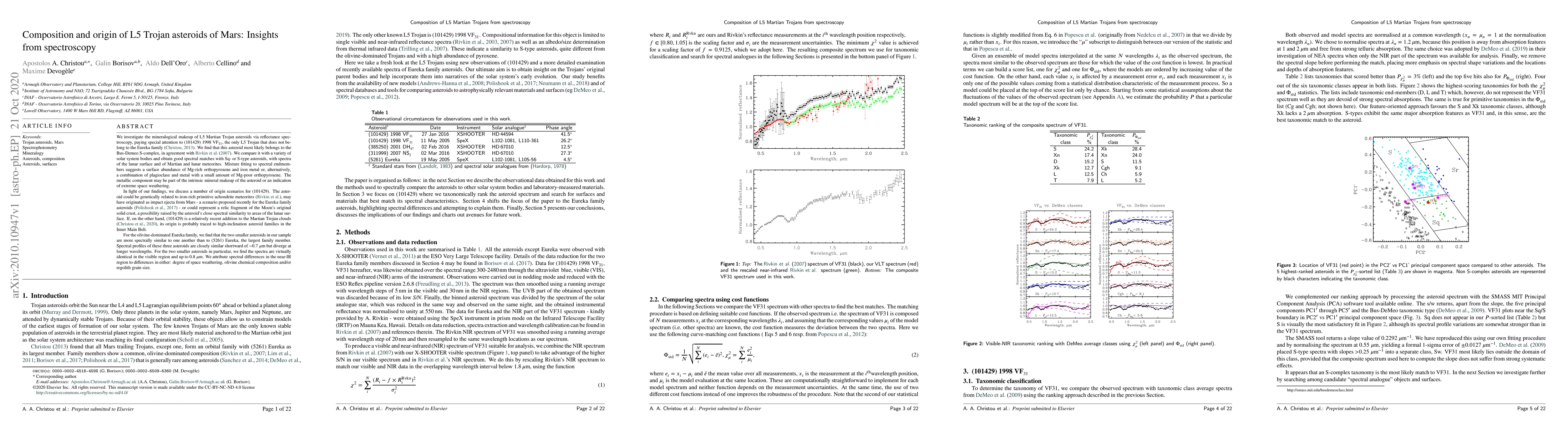 This study uses reflectance spectroscopy to analyze the mineralogy of L5 Martian Trojan asteroids, focusing on (101429) 1998 VF31, which is not part of the Eureka family. The asteroid likely belongs to the Bus-Demeo S-complex and contains a surface abundance of Mg-rich orthopyroxene and iron metal, suggesting possible origins linked to iron-rich primitive achondrites, Martian ejecta, or the Moon's crust. The Eureka family's spectral differences are attributed to varying degrees of space weathering and olivine composition.