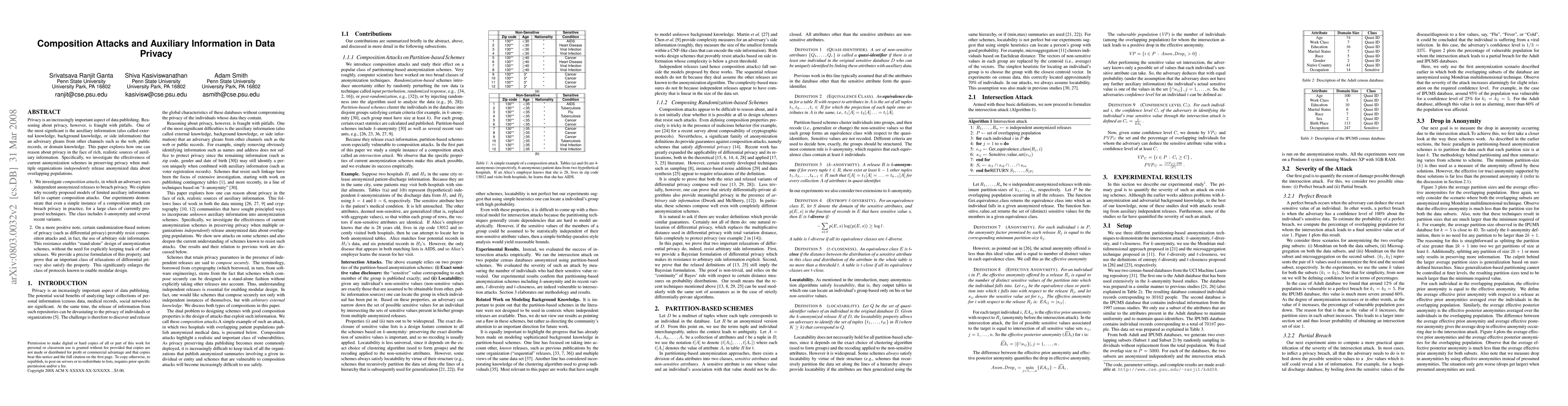 This paper explores how to reason about privacy in the face of rich auxiliary information, finding that current anonymization schemes fail to capture composition attacks but certain randomization-based notions like differential privacy can resist them.