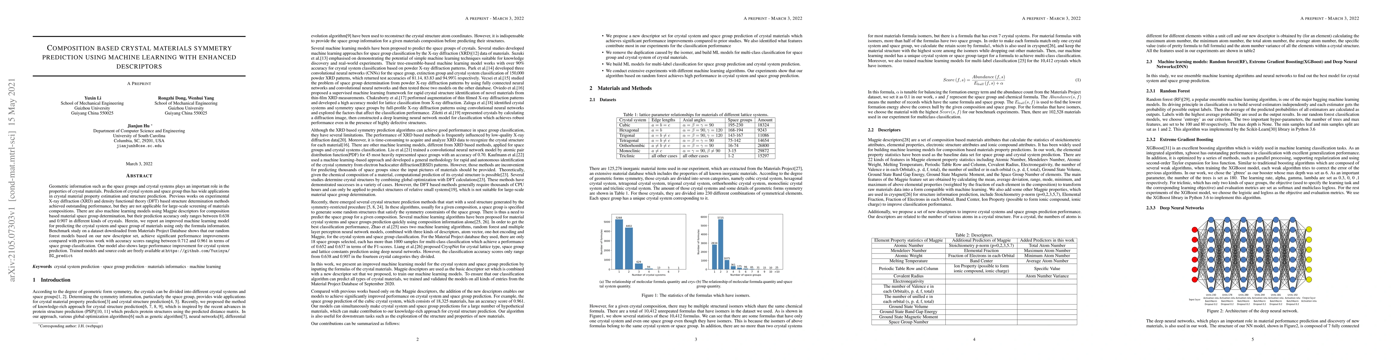 This paper presents an enhanced machine learning model using new descriptors for predicting crystal system and space group from material composition data, achieving higher accuracy (0.712-0.961) compared to previous methods. The new random forest models significantly improve upon existing Magpie descriptor-based approaches.