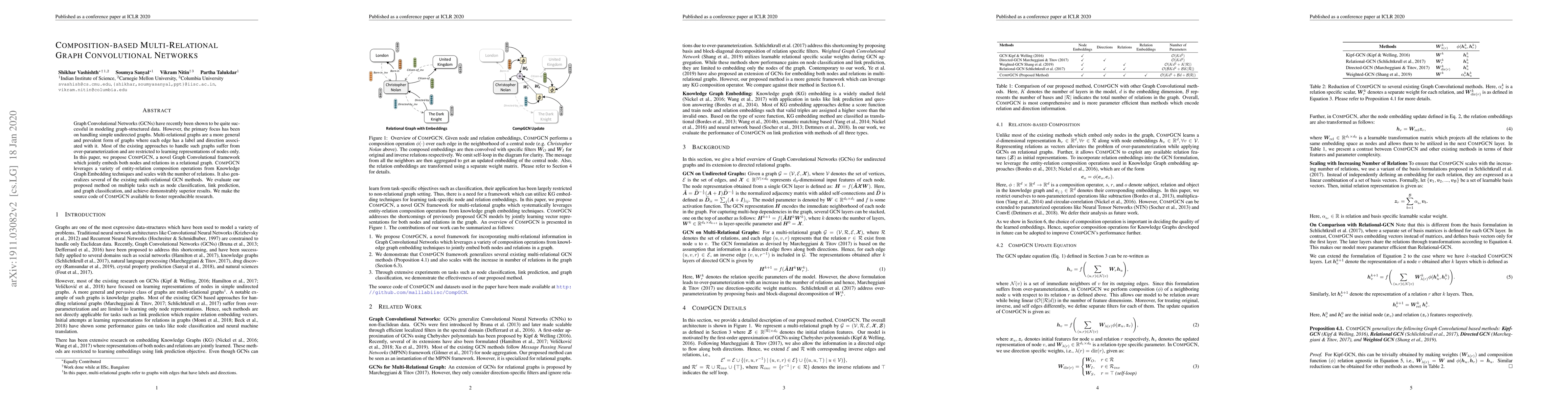 This paper introduces CompGCN, a novel Graph Convolutional Network that jointly embeds nodes and relations in multi-relational graphs, addressing over-parameterization and improving upon existing methods. The framework leverages composition operations from Knowledge Graph Embedding and achieves superior results in node, link, and graph classification tasks.