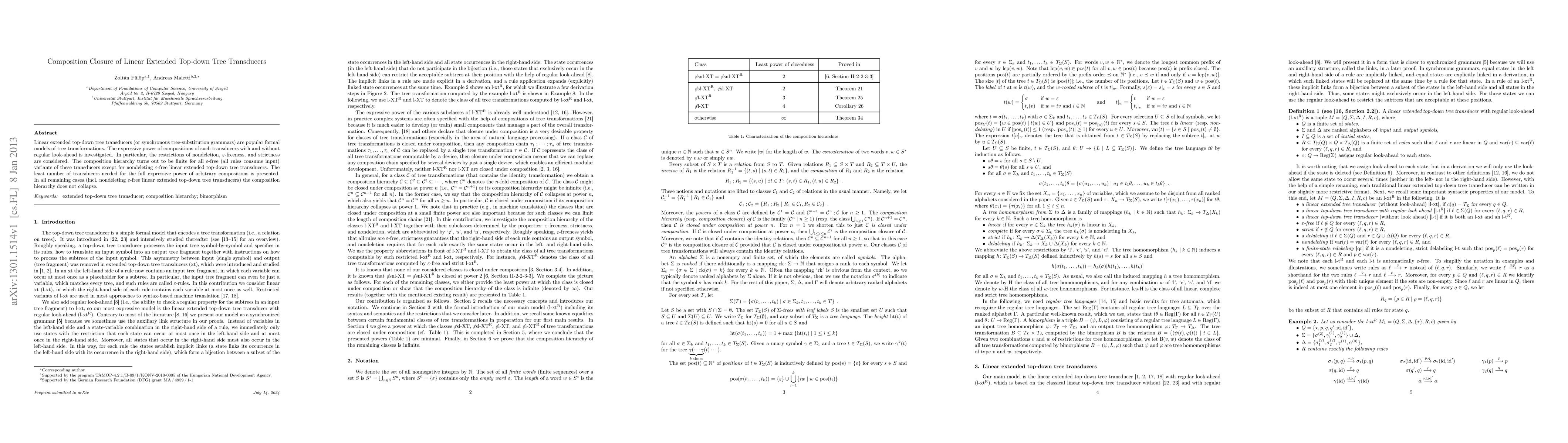 The paper investigates the composition closure of linear extended top-down tree transducers, showing a finite composition hierarchy for most variants except nondeleting epsilon-free ones. It determines the minimal number of transducers required for full expressive power in the finite cases.