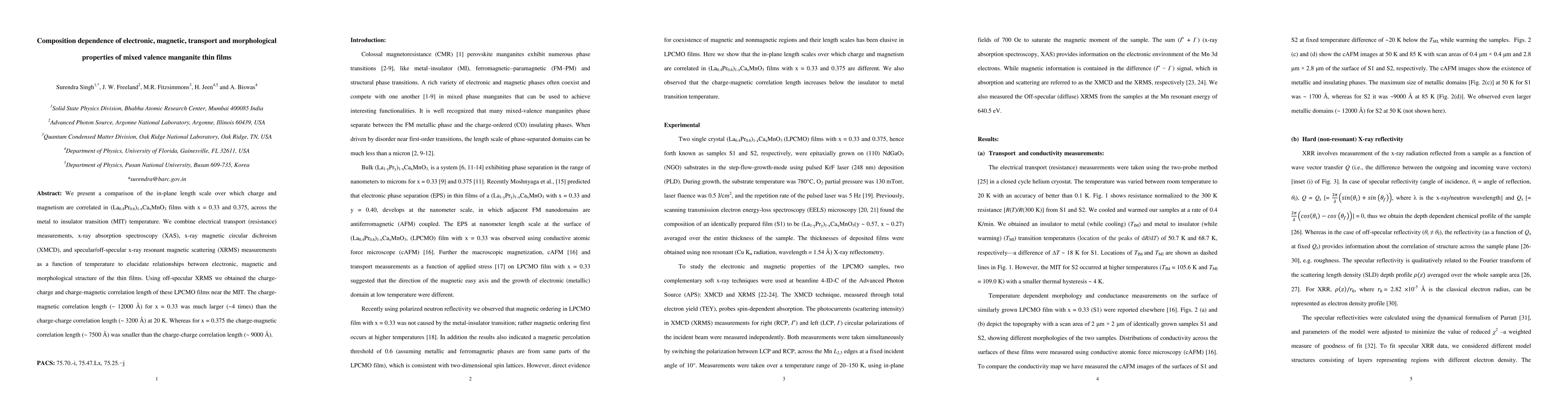 This study investigates the electronic, magnetic, transport, and morphological properties of mixed valence manganite thin films, specifically (La0.4Pr0.6)1-xCaxMnO3 with x = 0.33 and 0.375. It reveals significant differences in charge-magnetic and charge-charge correlation lengths near the metal-insulator transition temperature, using advanced spectroscopic and scattering techniques.