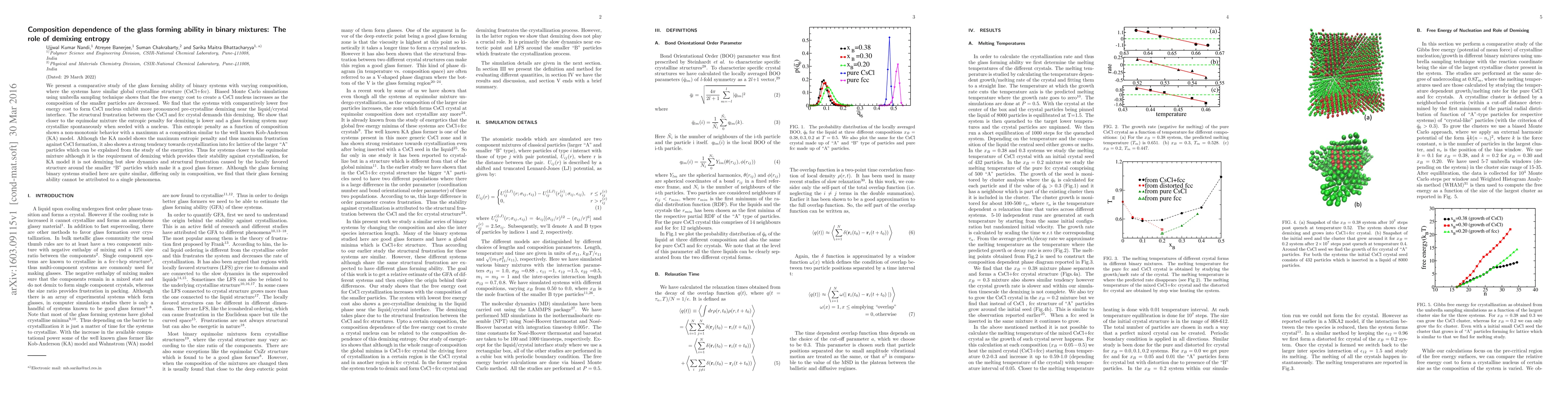 This study explores how varying composition in binary mixtures affects their glass forming ability, revealing that the free energy cost to form a CsCl nucleus increases with a lower proportion of smaller particles. The research finds that systems with lower free energy costs exhibit pre-crystalline demixing, driven by structural frustration between CsCl and fcc crystals, and that equimolar mixtures show a non-monotonic entropic penalty for demixing.