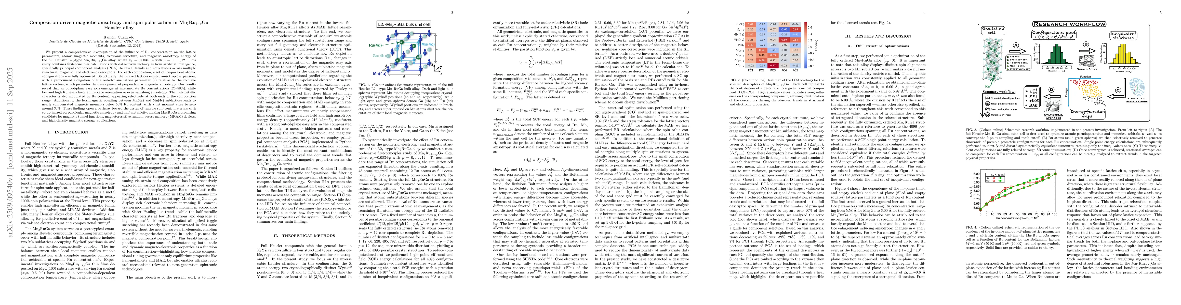 We present a comprehensive investigation of the influence of Ru concentration on the lattice parameters, atomic magnetic moments, electronic structure, and magnetic anisotropy energy of the full Heusler L2$_1$-type Mn$_2$Ru$_{1-x_p}$Ga alloy, where x$_p$ = 0.0834 p with p=0,...,12. This study combines first-principles calculations with data-driven techniques from artificial intelligence, specifically principal component analysis (PCA), to reveal trends and correlations across multiple structural, magnetic, and electronic descriptors. For each composition, a set of inequivalent atomic configurations was fully optimized. Structurally, the relaxed lattices exhibit anisotropic expansion, with a pronounced elongation of the out-of-plane lattice parameter ($c$) relative to the in-plane lattice vectors, which promotes the development of perpendicular magnetic anisotropy. Our results reveal that an out-of-plane easy axis emerges at intermediate Ru concentrations (25-28%), while low and high Ru levels favor an in-plane orientation or even vanishing anisotropy. The half-metallic character is also modulated by Ru content, appearing selectively at both ends of the composition range. Additionally, the ferrimagnetic coupling between Mn(4a) and Mn(4c) sublattices leads to nearly compensated magnetic moments below 50% Ru content, with a net moment close to zero around 30%. These findings open a pathway toward the design of tunable spintronic materials with co-optimized perpendicular magnetic anisotropy and half-metallicity, making Mn$_2$RuGa a promising candidate for magnetic tunnel junctions, magnetoresistive random-access memory (MRAM) devices, and high-density magnetic storage applications.