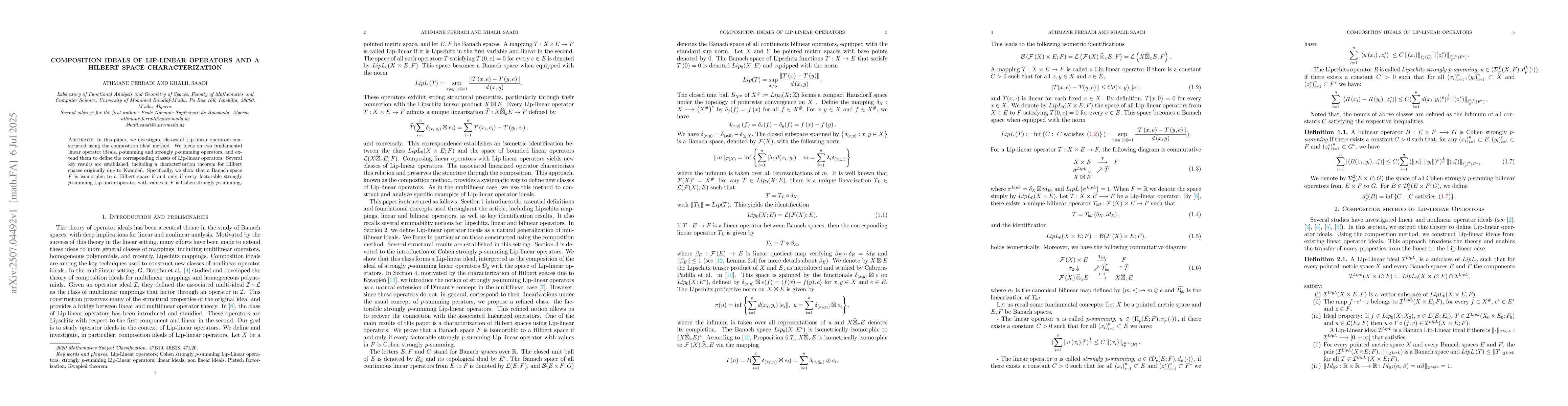 In this paper, we investigate classes of Lip-linear operators constructed using the composition ideal method. We focus on two fundamental linear operator ideals, $p$-summing and strongly $p$-summing operators, and extend them to define the corresponding classes of Lip-linear operators. Several key results are established, including a characterization theorem for Hilbert spaces originally due to Kwapie\'{n}. Specifically, we show that a Banach space $F$ is isomorphic to a Hilbert space if and only if every factorable strongly $p$-summing Lip-linear operator with values in $F$ is Cohen strongly $p$-summing.