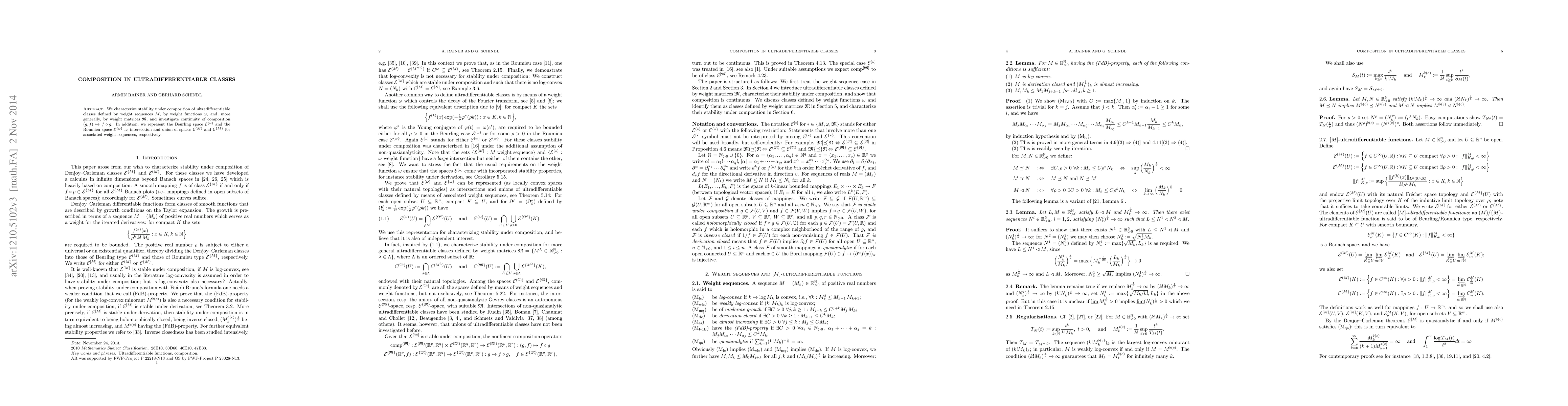 This paper characterizes the stability under composition of ultradifferentiable classes defined by various weight sequences, functions, and matrices, and explores the continuity of function composition. It also represents Beurling and Roumieu spaces as intersections and unions of spaces defined by associated weight sequences.