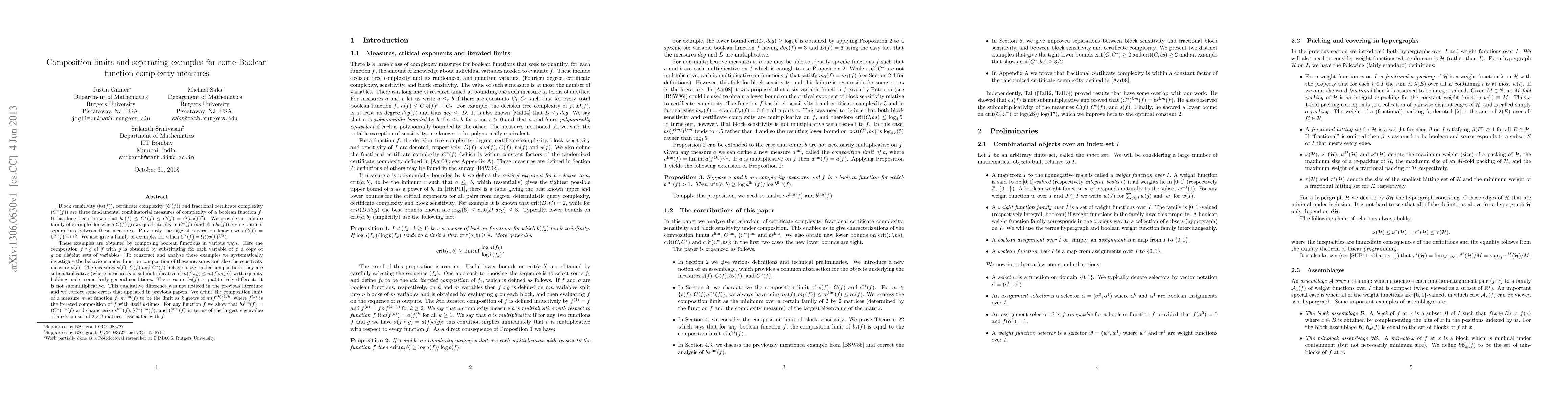 Block sensitivity ($bs(f)$), certificate complexity ($C(f)$) and fractional certificate complexity ($C^*(f)$) are three fundamental combinatorial measures of complexity of a boolean function $f$. It has long been known that $bs(f) \leq C^{\ast}(f) \leq C(f) =O(bs(f)^2)$. We provide an infinite family of examples for which $C(f)$ grows quadratically in $C^{\ast}(f)$ (and also $bs(f)$) giving optimal separations between these measures. Previously the biggest separation known was $C(f)=C^{\ast}(f)^{\log_{4.5}5}$. We also give a family of examples for which $C^{\ast}(f)=\Omega(bs(f)^{3/2})$. These examples are obtained by composing boolean functions in various ways. Here the composition $f \circ g$ of $f$ with $g$ is obtained by substituting for each variable of $f$ a copy of $g$ on disjoint sets of variables. To construct and analyse these examples we systematically investigate the behaviour under function composition of these measures and also the sensitivity measure $s(f)$. The measures $s(f)$, $C(f)$ and $C^{\ast}(f)$ behave nicely under composition: they are submultiplicative (where measure $m$ is submultiplicative if $m(f \circ g) \leq m(f)m(g)$) with equality holding under some fairly general conditions. The measure $bs(f)$ is qualitatively different: it is not submultiplicative. This qualitative difference was not noticed in the previous literature and we correct some errors that appeared in previous papers. We define the composition limit of a measure $m$ at function $f$, $m^{\lim}(f)$ to be the limit as $k$ grows of $m(f^{(k)})^{1/k}$, where $f^{(k)}$ is the iterated composition of $f$ with itself $k$-times. For any function $f$ we show that $bs^{\lim}(f) = (C^*)^{\lim}(f)$ and characterize $s^{\lim}(f), (C^*)^{\lim}(f)$, and $C^{\lim}(f)$ in terms of the largest eigenvalue of a certain set of $2\times 2$ matrices associated with $f$.