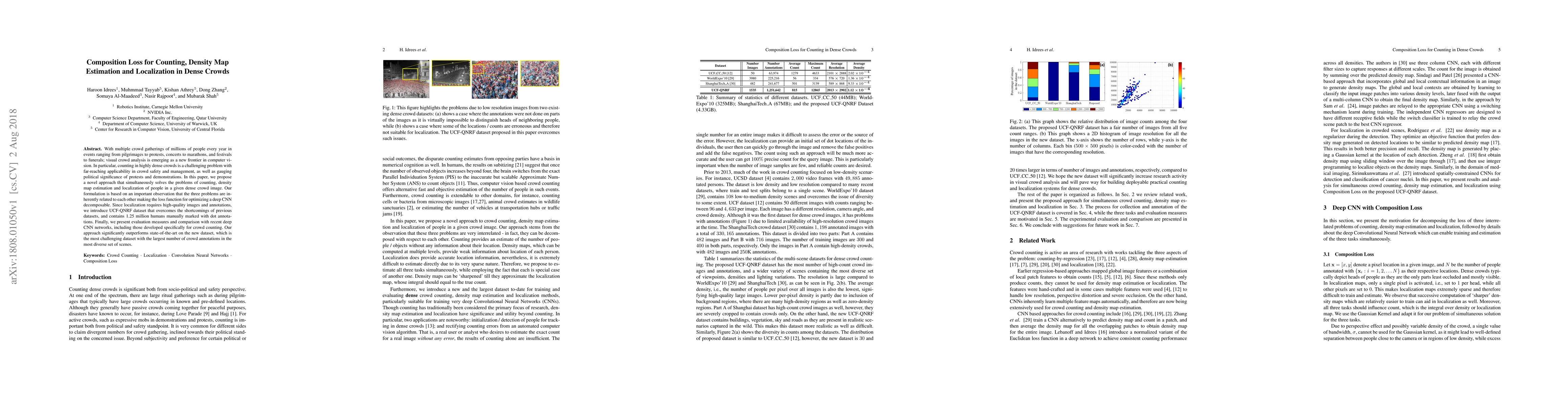 This research paper proposes a novel method for counting, density map estimation, and localization of individuals in dense crowds using a decomposable loss function based on deep CNNs. The authors introduce the UCF-QNRF dataset, which includes 1.25 million manually annotated human dots, addressing limitations of previous datasets. The proposed method outperforms existing state-of-the-art techniques on this challenging new dataset.