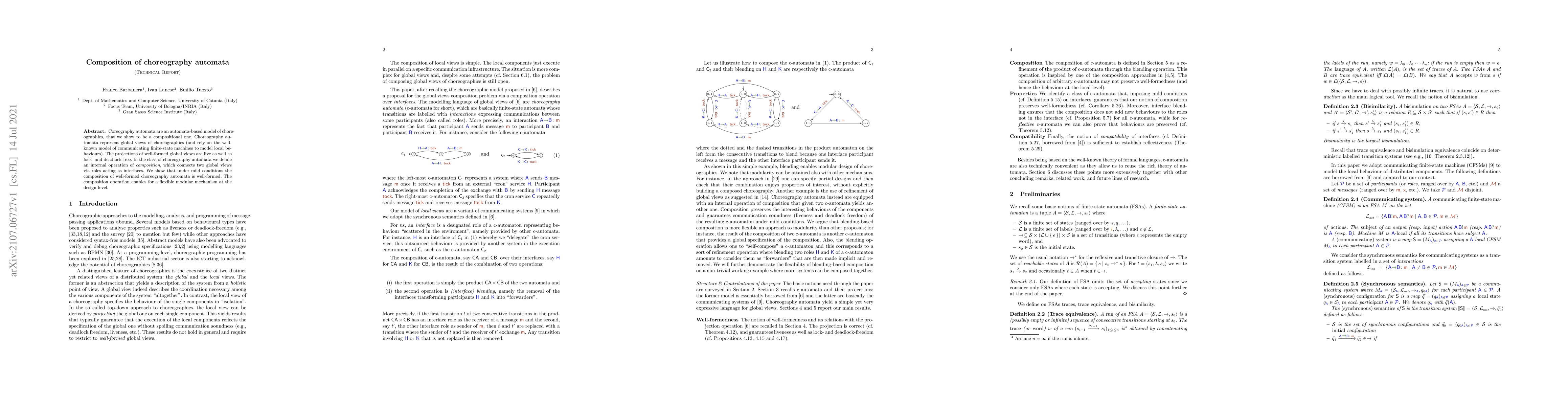 The paper presents a compositional model of choreographies based on finite-state automata (FSAs), introducing a composition operation for choreography automata that connects global views via roles acting as interfaces. The composition is shown to preserve well-formedness under mild conditions.