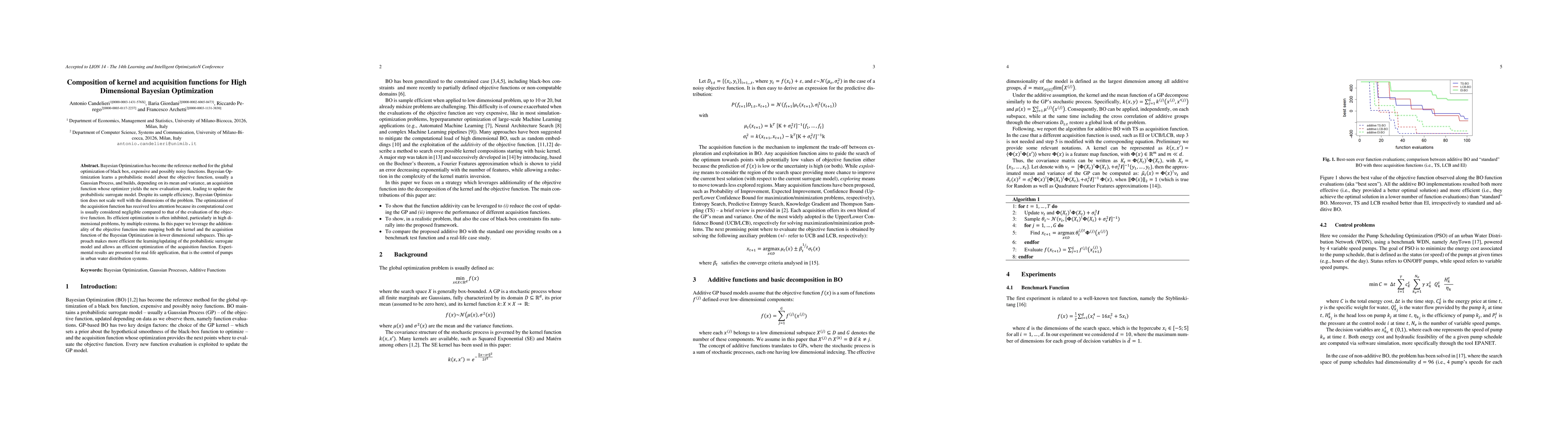 Bayesian Optimization has become the reference method for the global optimization of black box, expensive and possibly noisy functions. Bayesian Op-timization learns a probabilistic model about the objective function, usually a Gaussian Process, and builds, depending on its mean and variance, an acquisition function whose optimizer yields the new evaluation point, leading to update the probabilistic surrogate model. Despite its sample efficiency, Bayesian Optimiza-tion does not scale well with the dimensions of the problem. The optimization of the acquisition function has received less attention because its computational cost is usually considered negligible compared to that of the evaluation of the objec-tive function. Its efficient optimization is often inhibited, particularly in high di-mensional problems, by multiple extrema. In this paper we leverage the addition-ality of the objective function into mapping both the kernel and the acquisition function of the Bayesian Optimization in lower dimensional subspaces. This ap-proach makes more efficient the learning/updating of the probabilistic surrogate model and allows an efficient optimization of the acquisition function. Experi-mental results are presented for real-life application, that is the control of pumps in urban water distribution systems.