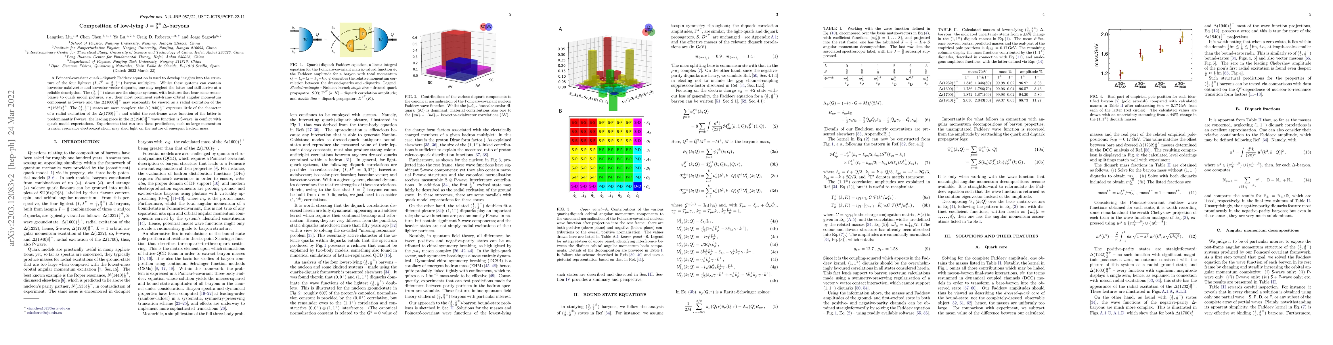 A Poincar\'e-covariant quark+diquark Faddeev equation is used to develop insights into the structure of the four lightest $(I,J^P=\tfrac{3}{2},\tfrac{3}{2}^\pm)$ baryon multiplets. Whilst these systems can contain isovector-axialvector and isovector-vector diquarks, one may neglect the latter and still arrive at a reliable description. The $(\tfrac{3}{2},\tfrac{3}{2}^+)$ states are the simpler systems, with features that bear some resemblance to quark model pictures, \emph{e.g}., their most prominent rest-frame orbital angular momentum component is $\mathsf S$-wave and the $\Delta(1600)\tfrac{3}{2}^+$ may reasonably be viewed as a radial excitation of the $\Delta(1232)\tfrac{3}{2}^+$. The $(\tfrac{3}{2},\tfrac{3}{2}^-)$ states are more complex: the $\Delta(1940)\tfrac{3}{2}^-$ expresses little of the character of a radial excitation of the $\Delta(1700)\tfrac{3}{2}^-$; and whilst the rest-frame wave function of the latter is predominantly $\mathsf P$-wave, the leading piece in the $\Delta(1940)\tfrac{3}{2}^-$ wave function is $\mathsf S$-wave, in conflict with quark model expectations. Experiments that can test these predictions, such as large momentum transfer resonance electroexcitation, may shed light on the nature of emergent hadron mass.
