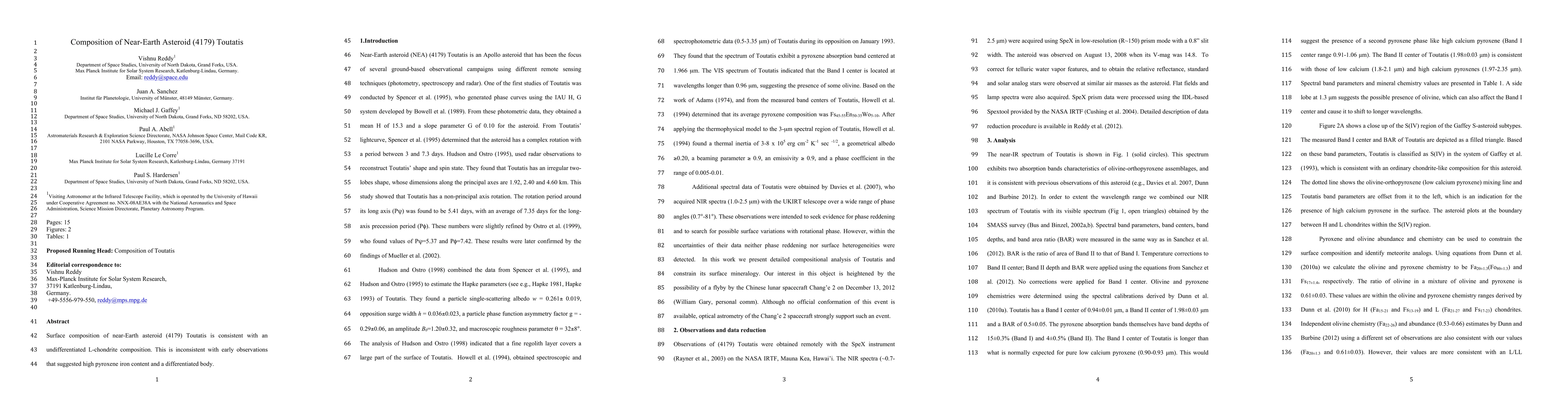 Surface composition of near-Earth asteroid (4179) Toutatis is consistent with an undifferentiated L-chondrite composition. This is inconsistent with early observations that suggested high pyroxene iron content and a differentiated body.